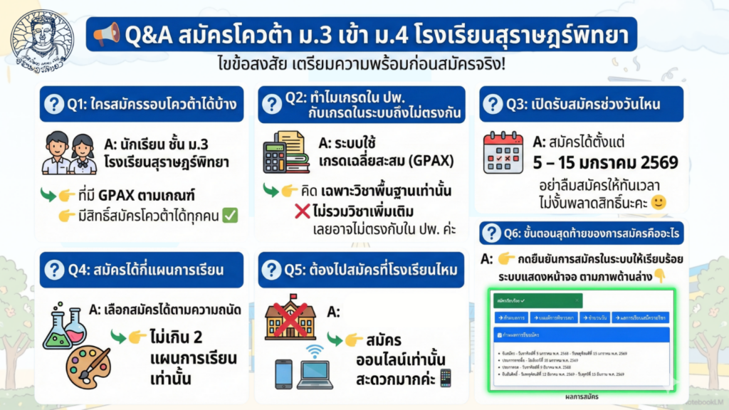 รายงานตัว – วันพฤหัสบดีที่ 2 เมษายน พ.ศ. 2569 เวลา 12:00 – 13:00 น. (ไม่รายงานตัว ถือว่าสละสิทธิ์) ณ โรงเรียนสุราษฎร์พิทยา