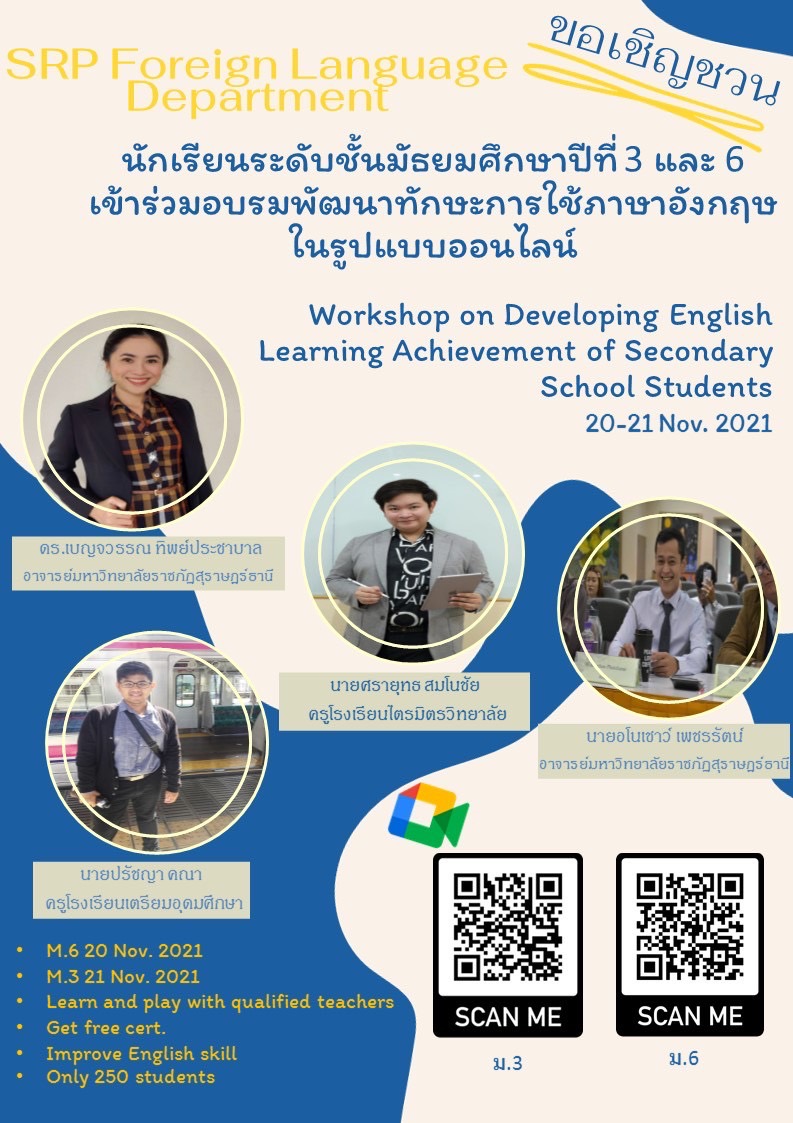 กลุ่มสาระฯภาษาต่างประเทศ โรงเรียนสุราษฎร์พิทยา ขอเชิญชวนนักเรียนระดับชั้น ม.3 และ ม.6 เข้าร่วมการอบรมเพื่อพัฒนาทักษะภาษาอังกฤษ ในรูปแบบออนไลน์ Workshop on Developing English Learning Achievement of Secondary School Students