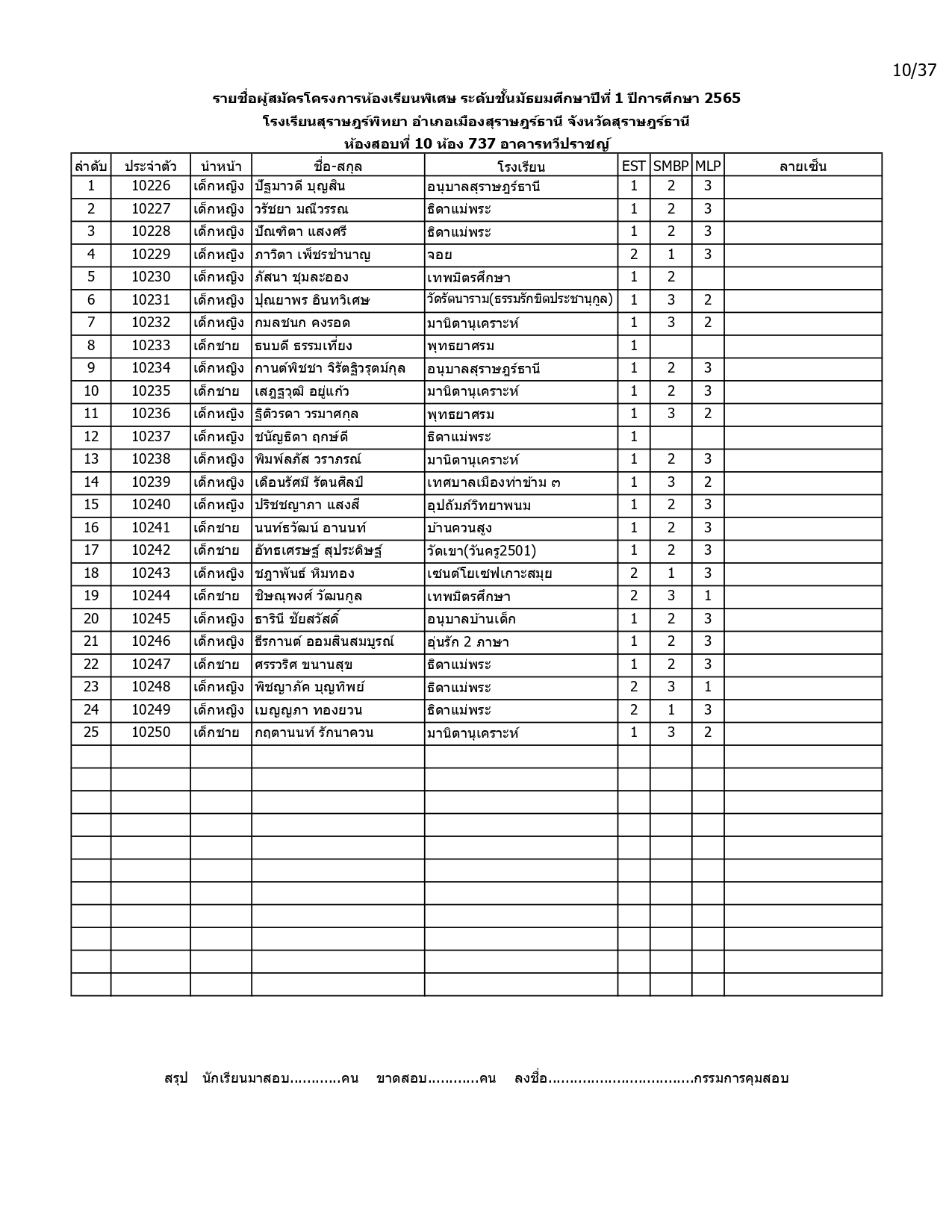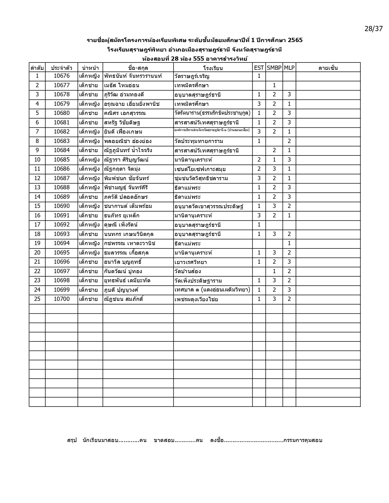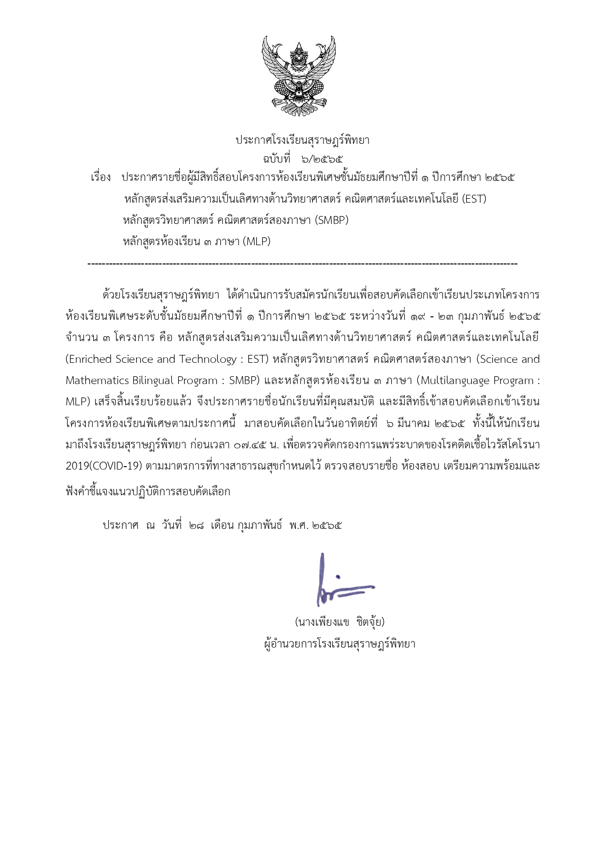 ประกาศรายชื่อผู้มีสิทธิ์สอบคัดเลือกเข้าศึกษาต่อชั้นมัธยมศึกษาปีที่ 1 ปีการศึกษา 2565 ประเภทโครงการห้องเรียนพิเศษ