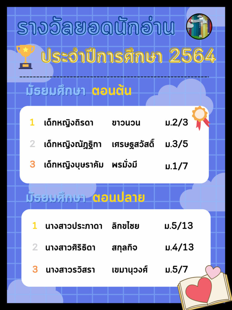 ประกาศรายชื่อนักเรียนผู้ที่ได้รับรางวัล “ยอดนักอ่าน” ประจำปีการศึกษา 2564 / ข่าวประกาศ / By สุธน ภักดี ติดต่อรับของรางวัลคลิกที่นี่ Post Views: 56