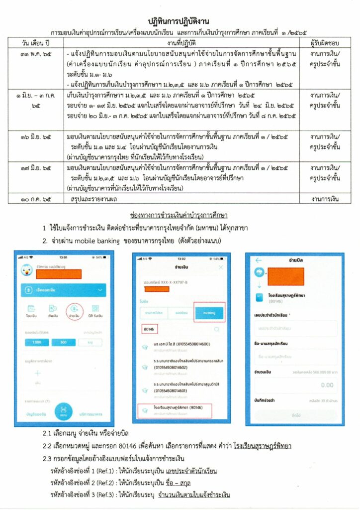 เก็บเงินค่าบำรุงการศึกษา ภาคเรียนที่ 1/65 สำหรับนักเรียนระดับชั้น ม. 2,3,5 และ 6 ระหว่างวันที่ 1 มิ.ย– 3 ก.ค.65 รับชำระผ่านธนาคารกรุงไทย จำกัด (มหาชน)ทุกสาขา โดยสามารถชำระได้ 2 ช่องทาง คือ