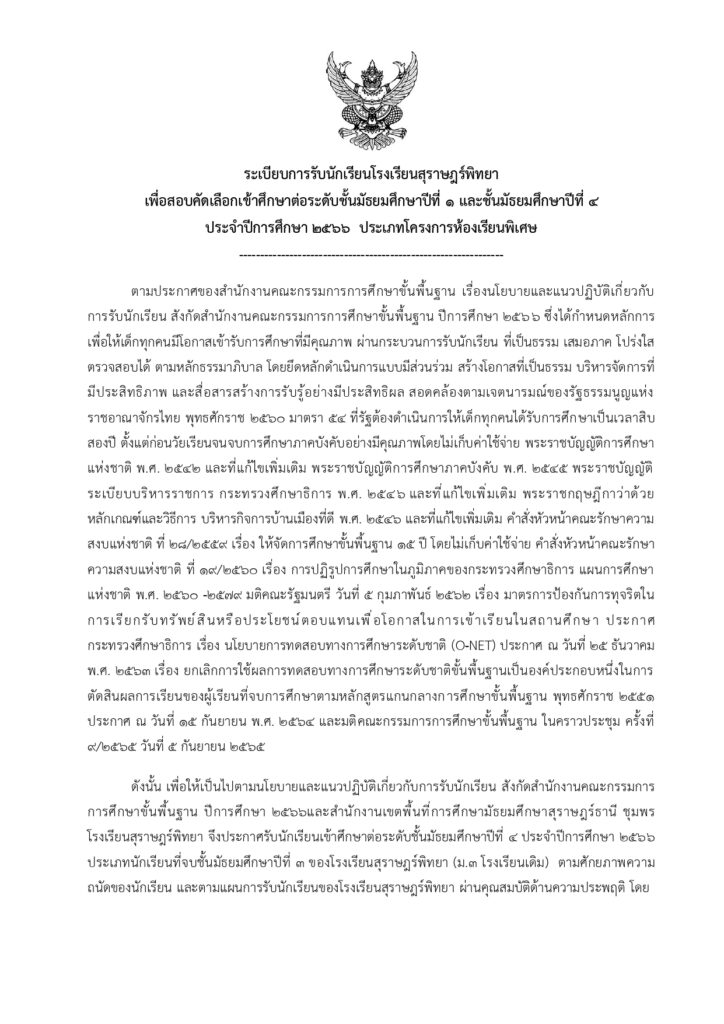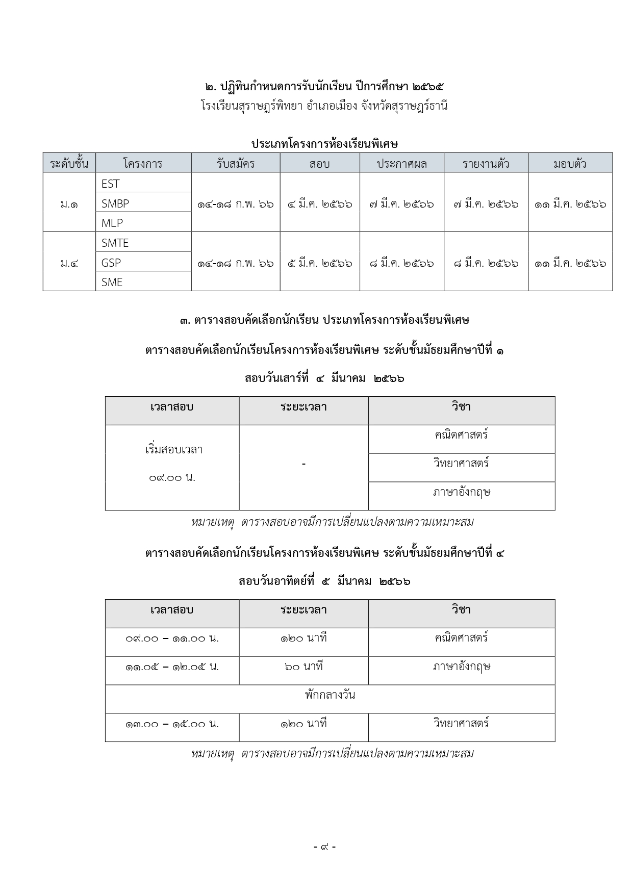 ระเบียบการรับนักเรียนโรงเรียนสุราษฎร์พิทยา ประจำปีการศึกษา 2566 ประเภทโครงการห้องเรียนพิเศษ / ข่าวประกาศ, โครงการห้องเรียนพิเศษ / By สุธน ภักดี สมัครโครงการห้องเรียนพิเศษคลิกที่นี่ *หมายเหตุ ตารางสอบ ม.1 ม.4 อาจมีการเปลี่ยนแปลงตามความเหมาะสม Post Views: 1,400
