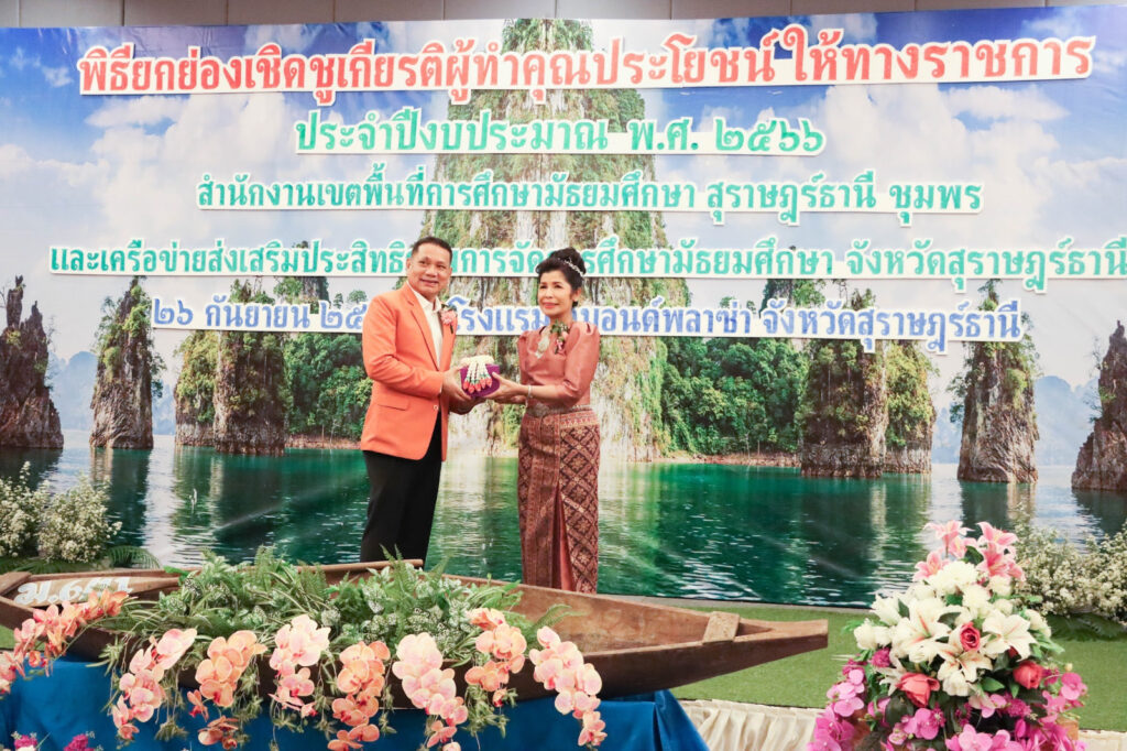 วันอังคารที่ 26 กันยายน พ.ศ. 2566 นางเพียงแข ชิตจุ้ย ผู้อำนวยการโรงเรียนสุราษฎร์พิทยา พร้อมด้วย คณะผู้บริหาร ครูผู้เกษียณอายุราชการ  คณะครูโรงเรียนสุราษฎร์พิทยา ร่วมพิธียกย่องเชิดชูเกียรติ ผู้ทำคุณประโยชน์ให้ทางราชการ ประจำปีงบประมาณ พ.ศ.2566 สำนักงานเขตพื้นที่การศึกษามัธยมศึกษาสุราษฎร์ธานี ชุมพร โดยเครือข่ายส่งเสริมประสิทธิภาพการจัดการศึกษา โดยมีนายนันทวัธ เจริญวรรณ รองผู้ว่าราชการจังหวัดสุราษฎร์ธานี เป็นประธานในพิธี  ณ ห้องประกายเพชร โรงแรมไดมอนด์ พลาซ่า จังหวัดสุราษฎร์ธานี