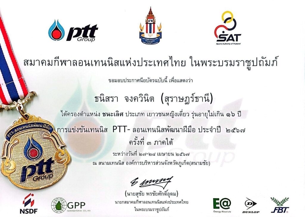 ชนะเลิศ PTT-ลอนเทนนิสพัฒนาฝีมือ ครั้งที่ 3 ภาคใต้ (South) / ผลงานดีเด่น / By สุธน ภักดี นางสาวธนิสรา จงควินิต ม.5/6 ได้รับรางวัลชนะเลิศ ประเภทเยาวหญิงเดี่ยวอายุไม่เกิน 16 ปี ในรายการ – PTT-ลอนเทนนิสพัฒนาฝีมือ ครั้งที่ 3 ภาคใต้ (South) เมื่อวันที่ 27-28 เมษายน 2567 ณ สนามกีฬากลาง (สนามชัย) จังหวัดภูเก็ต Post Views: 18