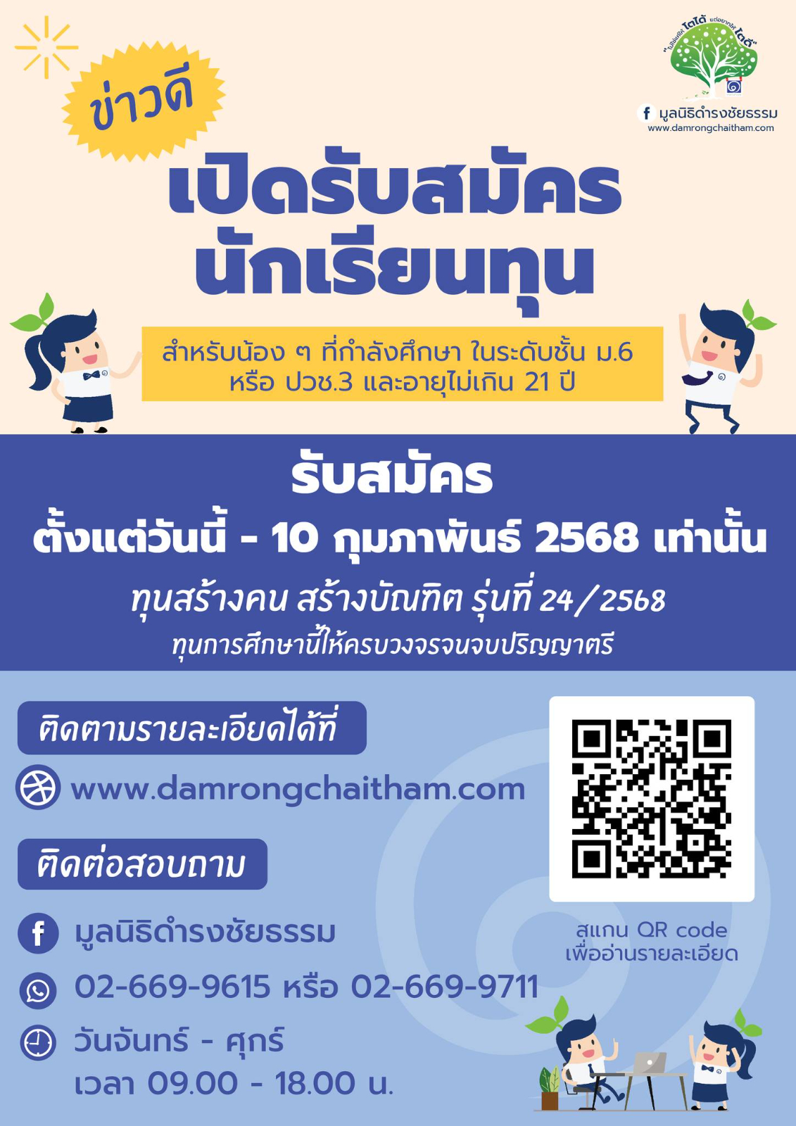 “มูลนิธิดำรงชัยธรรม” เปิดรับสมัครทุนการศึกษาระดับปริญญาตรี (ทุนต่อเนื่อง แบบครบวงจร)