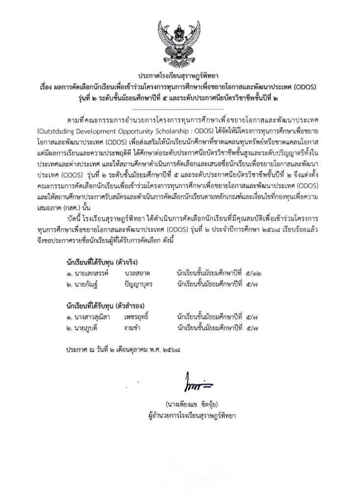 ประกาศโรงเรียนสุราษฎร์พิทยา เรื่อง ผลการคัดเลือกนักเรียน เพื่อเข้าร่วมโครงการทุนการศึกษาเพื่อขยายโอกาส