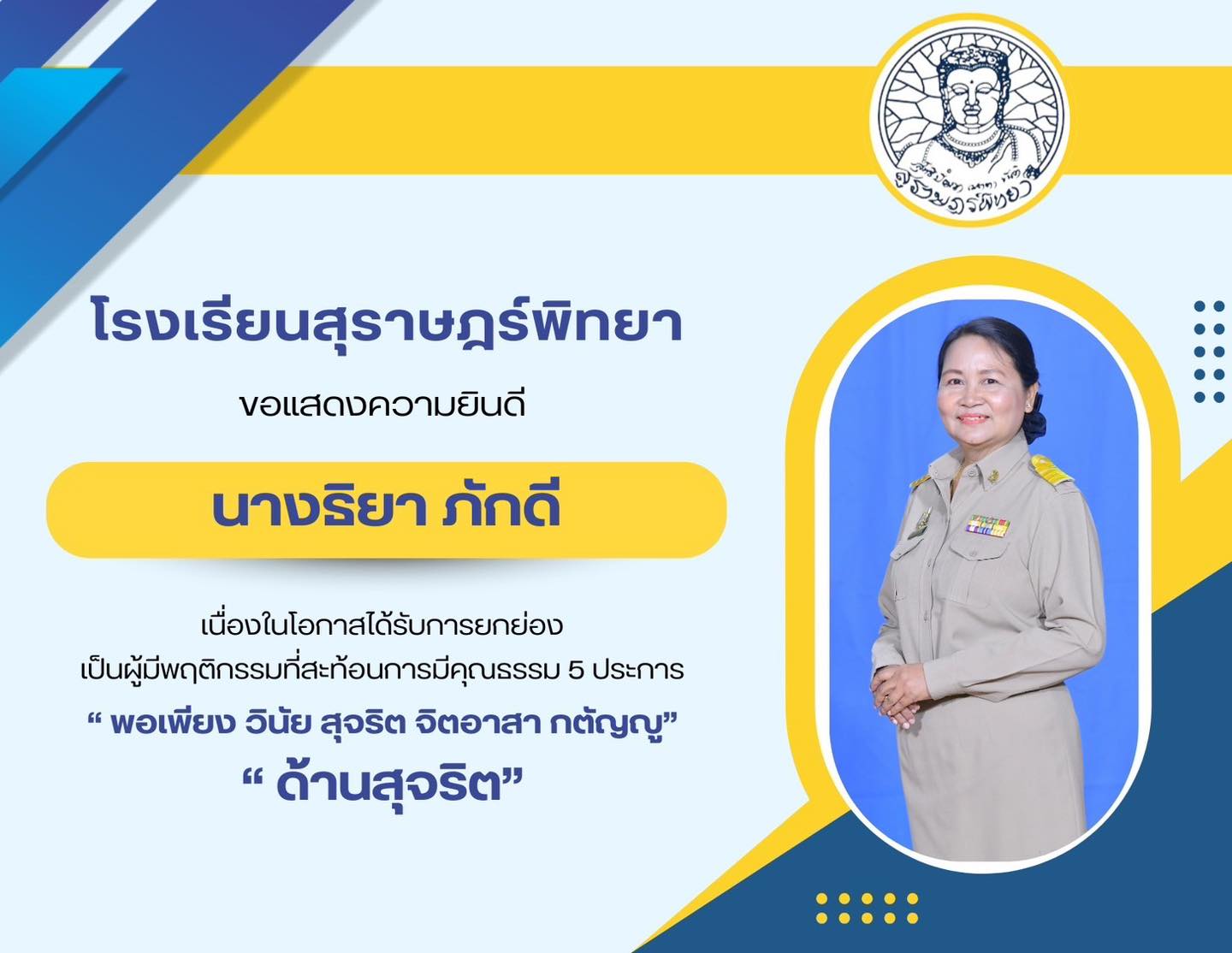 โรงเรียนสุราษฎร์พิทยา ขอแสดงความยินดีกับ ครูโรงเรียนสุราษฎร์พิทยา นางธิยา ภักดี เนื่องในโอกาสได้รับการยกย่อง
