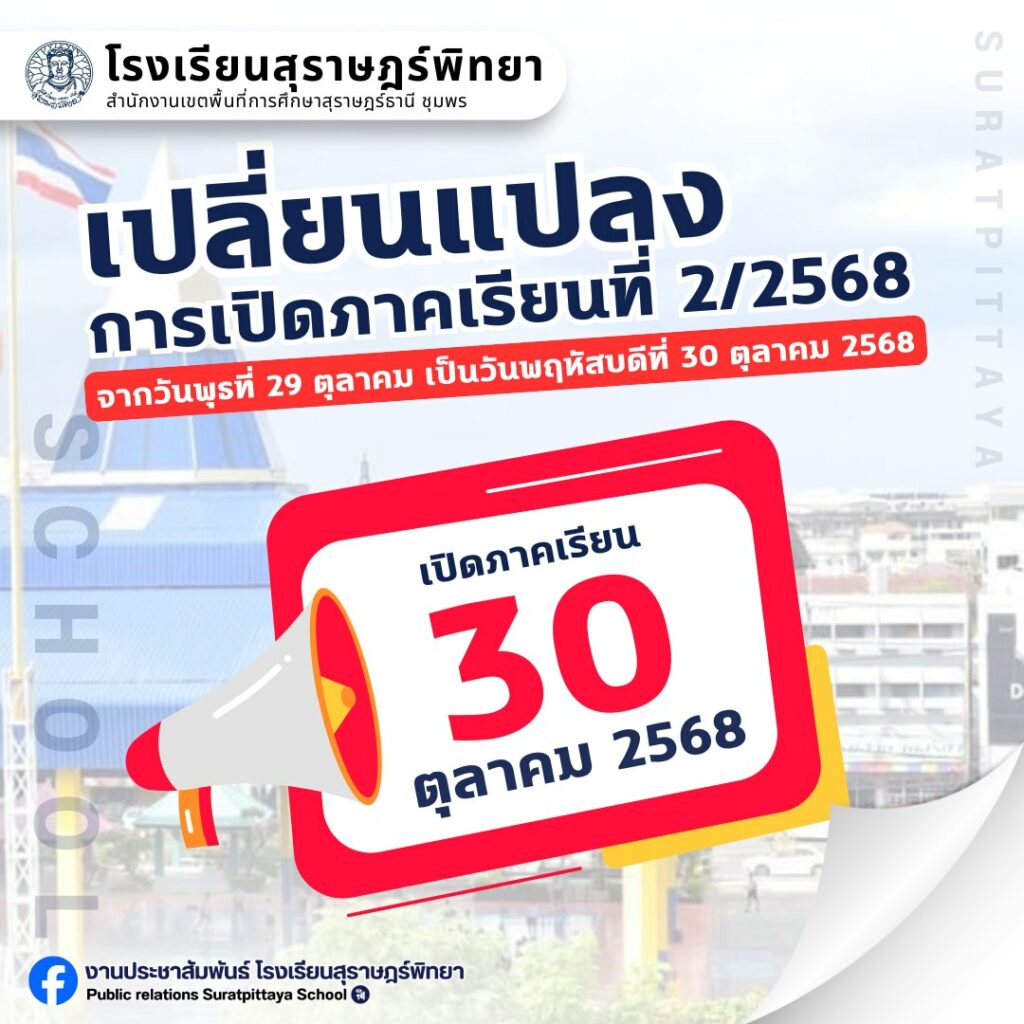 ประกาศเปลี่ยนแปลงกำหนดการเปิดภาคเรียนที่ 2/2568 เป็นวันที่ 30 ตุลาคม 2568 / ข่าวประกาศ / By สุธน ภักดี Post Views: 144