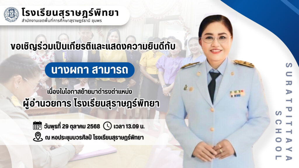 ขอเชิญร่วมเป็นเกียรติและแสดงความยินดีกับ นางผกา สามารถ / ข่าวประชาสัมพันธ์ / By สุธน ภักดี โรงเรียนสุราษฎร์พิทยา ขอเชิญร่วมเป็นเกียรติและแสดงความยินดีกับ นางผกา สามารถ เนื่องในโอกาสย้ายมาดำรงตำแหน่ง ผู้อำนวยการโรงเรียนสุราษฎร์พิทยา ในวันพุธที่ 29 ตุลาคม 2568 เวลา 13.09 น. ณ หอประชุมบวรศิลป์ โรงเรียนสุราษฎร์พิทยา Post Views: 3