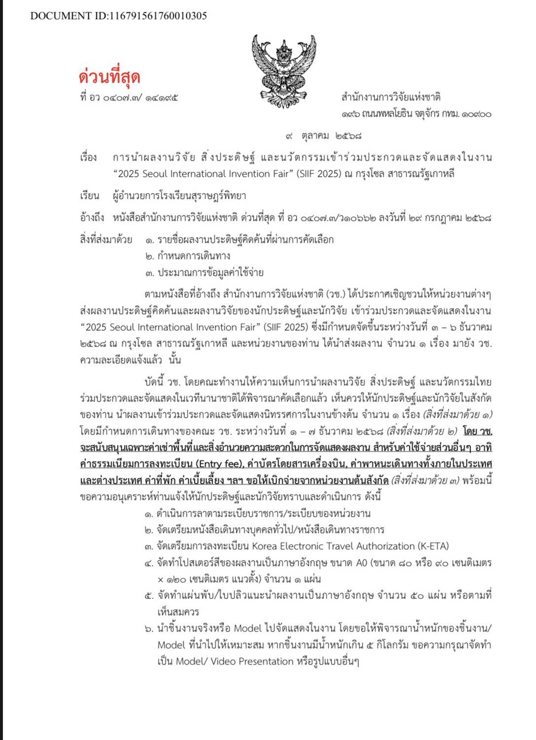 ได้ผ่านการคัดเลือกเข้าแข่งขันต่อในรายการ 2025 Seoul International Invention Fair” (SIIF 2025) ที่ประเทศเกาหลี