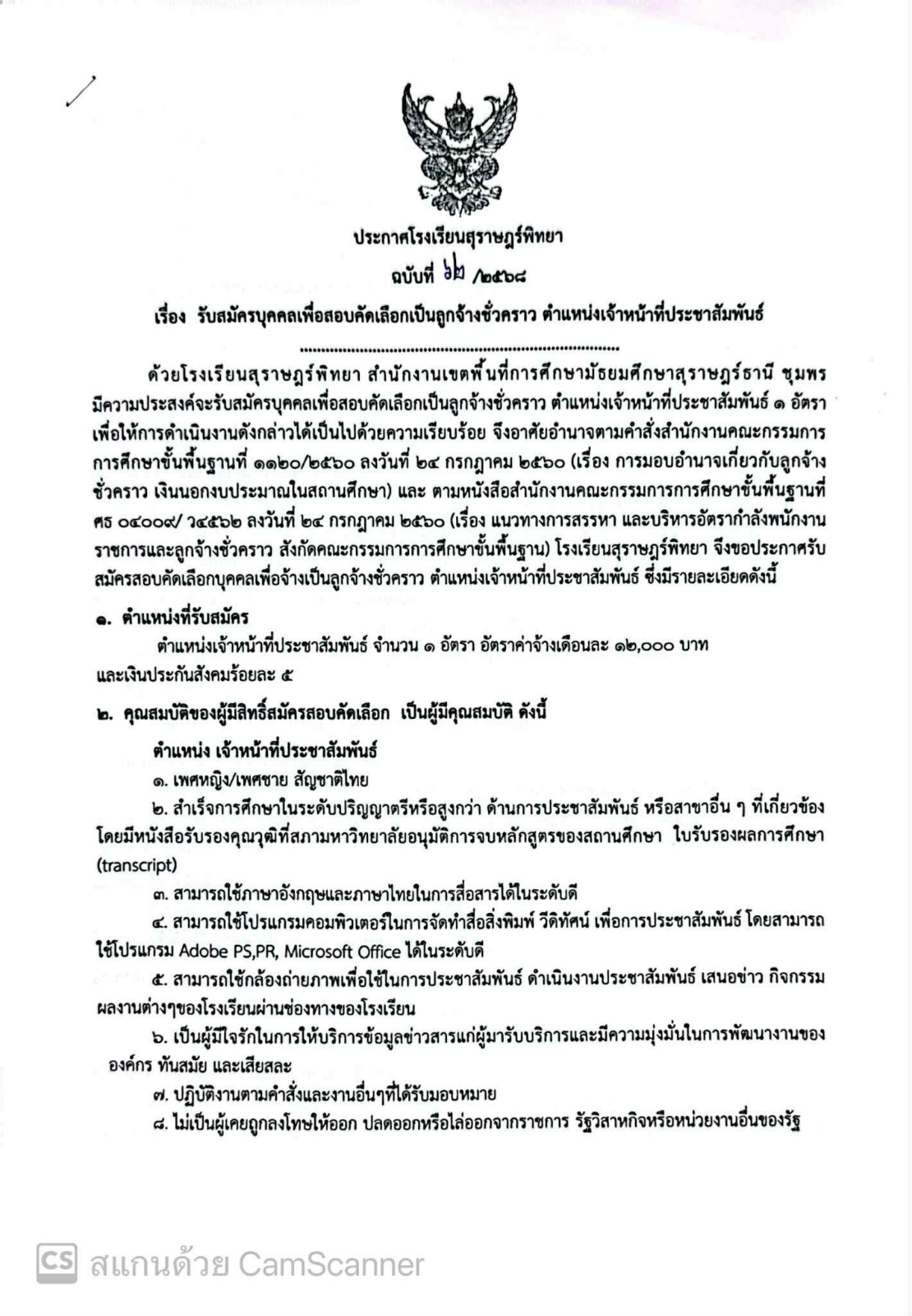 รับสมัครบุคคลเพื่อสอบคัดเลือกเป็นลูกจ้างชั่วคราว ตำแหน่งเจ้าหน้าที่ประชาสัมพันธ์ / ข่าวประกาศ / By สุธน ภักดี Post Views: 10