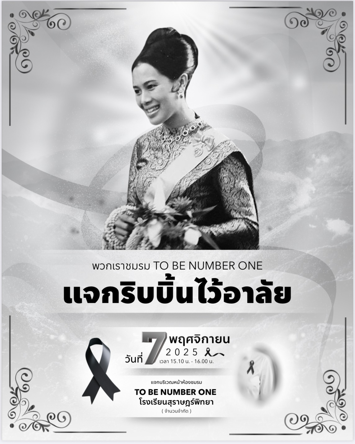 ด้วยสำนึกในพระมหากรุณาธิคุณ และเพื่อแสดงความอาลัยต่อการเสด็จสวรรคตของ สมเด็จพระนางเจ้าสิริกิติ์ พระบรมราชินีนาถ พระบรมราชชนนีพันปีหลวง ทางชมรม TO BE NUMBER ONE โรงเรียนสุราษฎร์พิทยา ขอน้อมรำลึกในพระมหากรุณาธิคุณอันหาที่สุดมิได้ จึงขอเชิญคณะครู บุคลากร และนักเรียนทุกท่าน ร่วมรับริบบิ้นไว้ทุกข์ (ฟรี จำนวนจำกัด) เพื่อแสดงความอาลัย