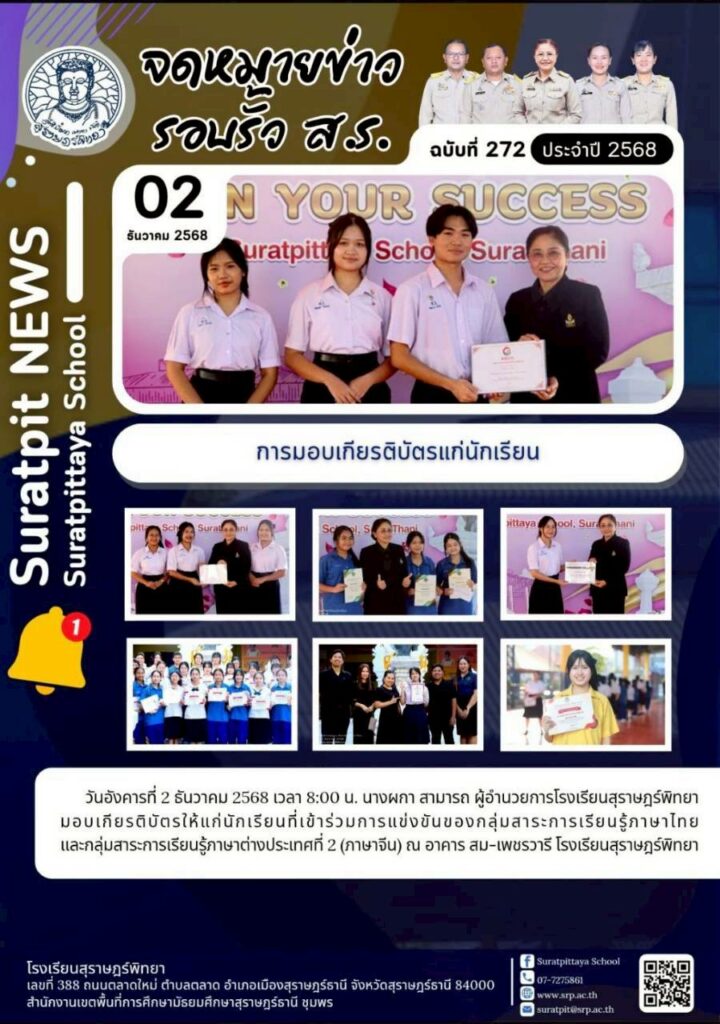 • มอบเกียรติบัตรนักเรียน กลุ่มสาระการเรียนรู้ภาษาไทยและกลุ่มสาระการเรียนรู้ภาษาต่างประเทศที่ 2 (ภาษาจีน)