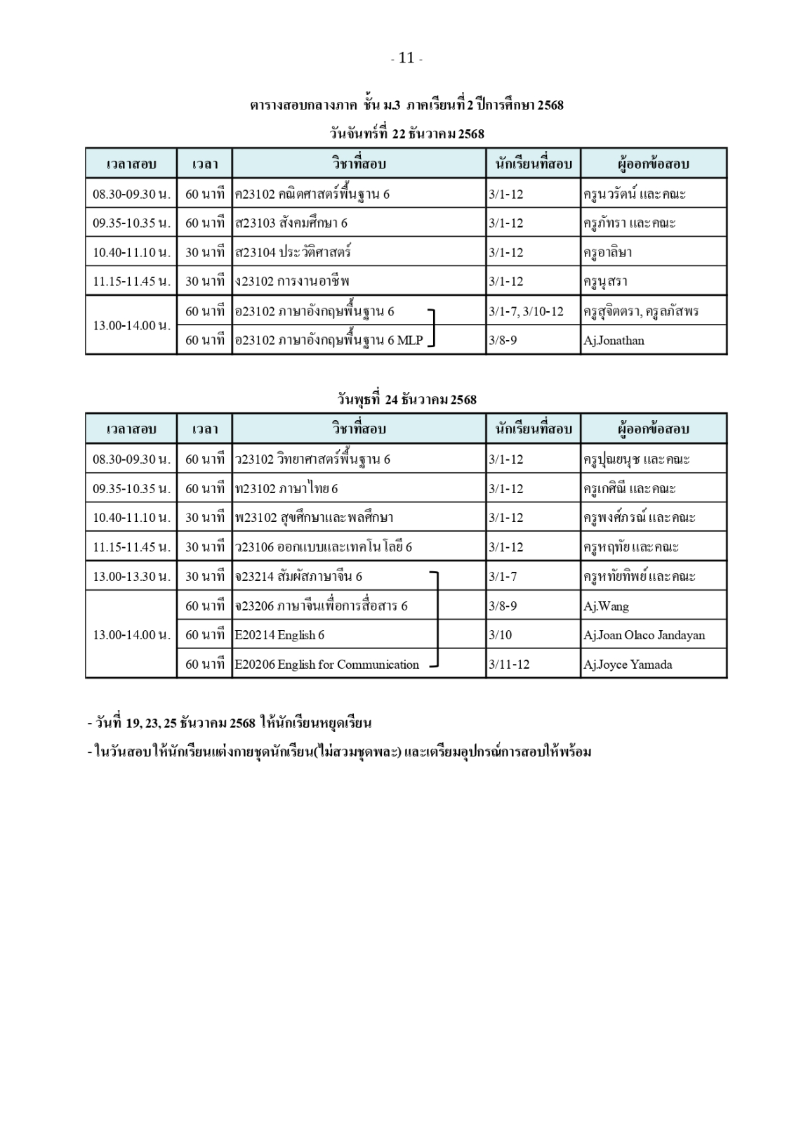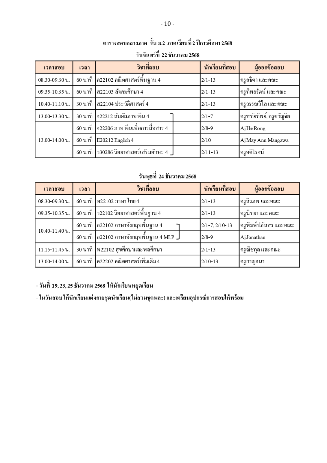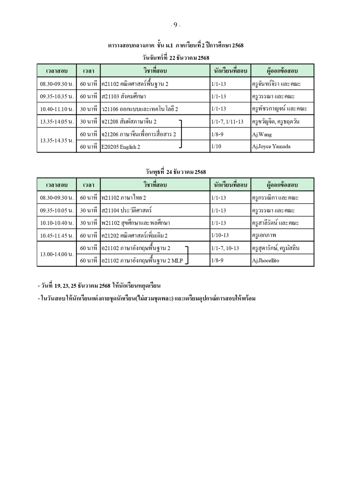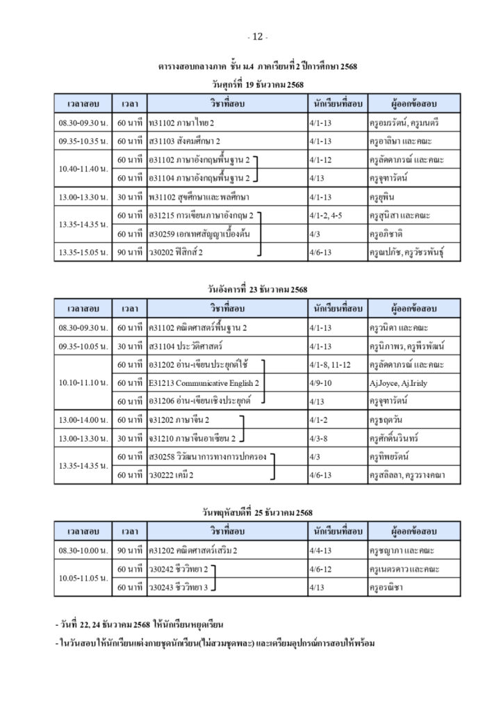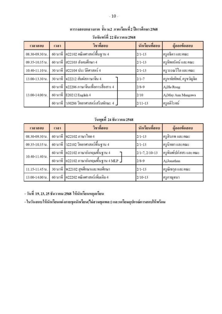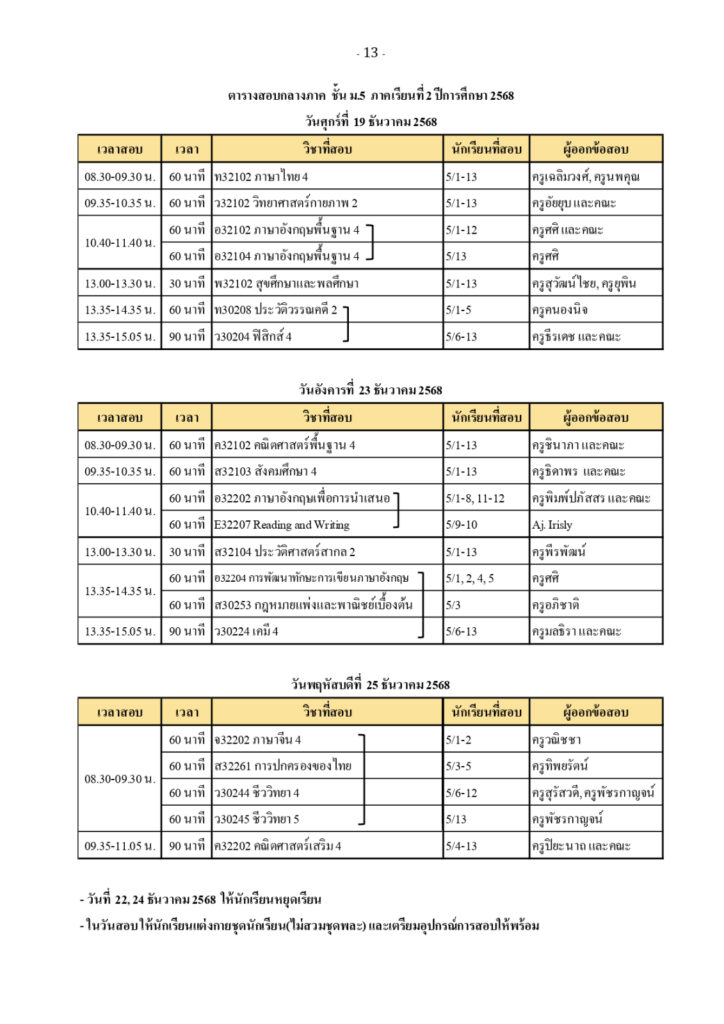 ตารางสอบวัดผลกลางภาค ภาคเรียนที่ 2 ปีการศึกษา 2568