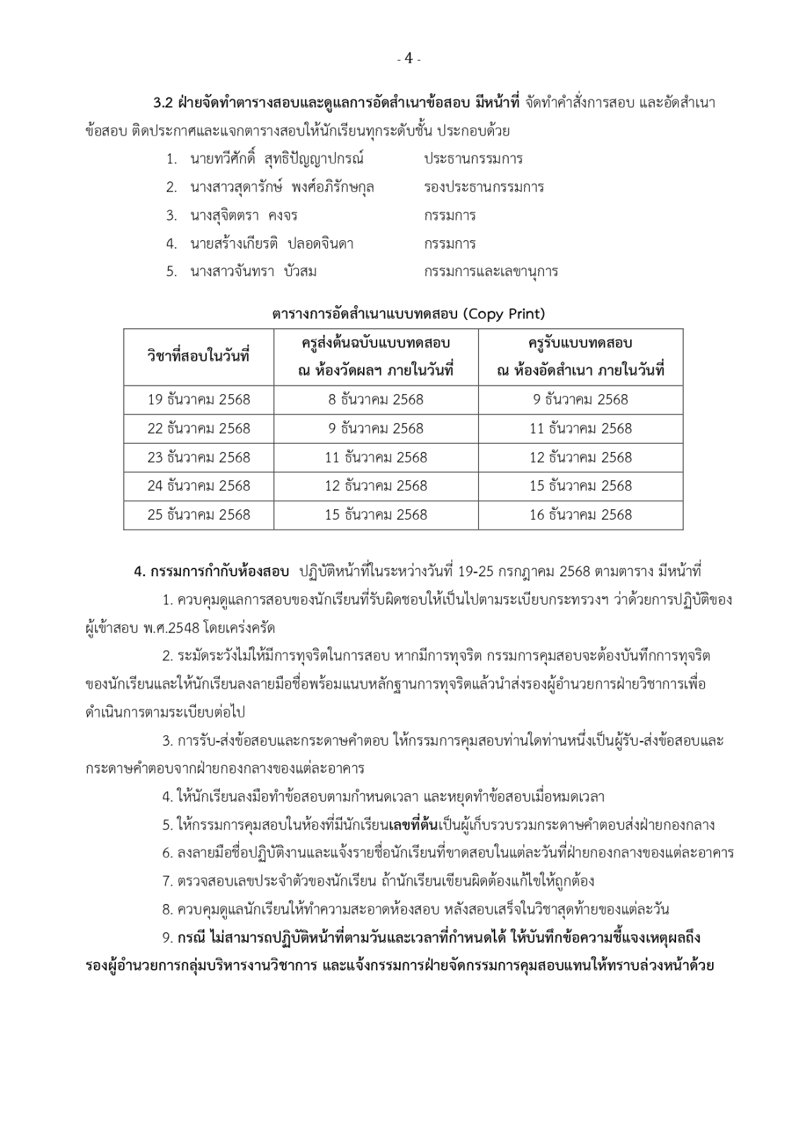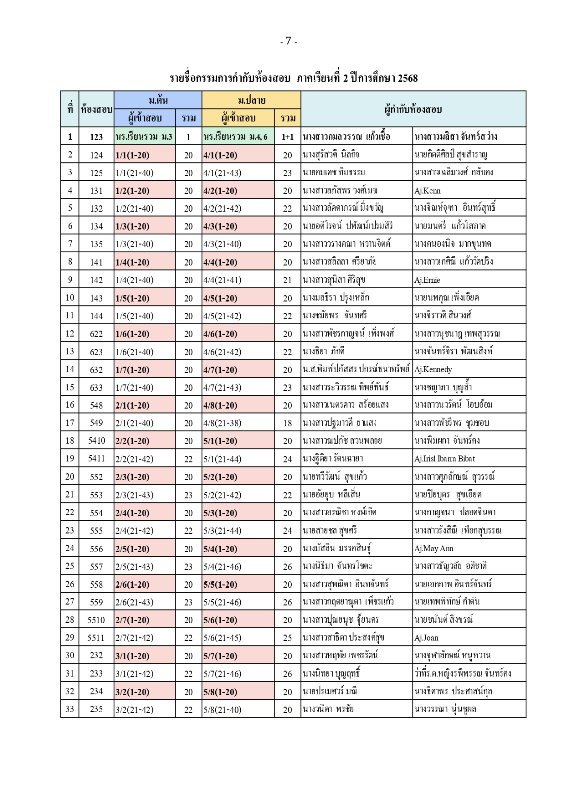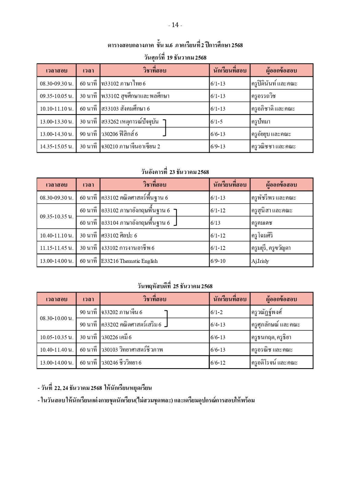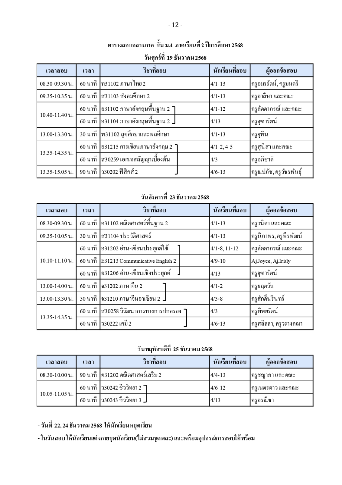 ตารางสอบวัดผลกลางภาค ภาคเรียนที่ 2 ปีการศึกษา 2568