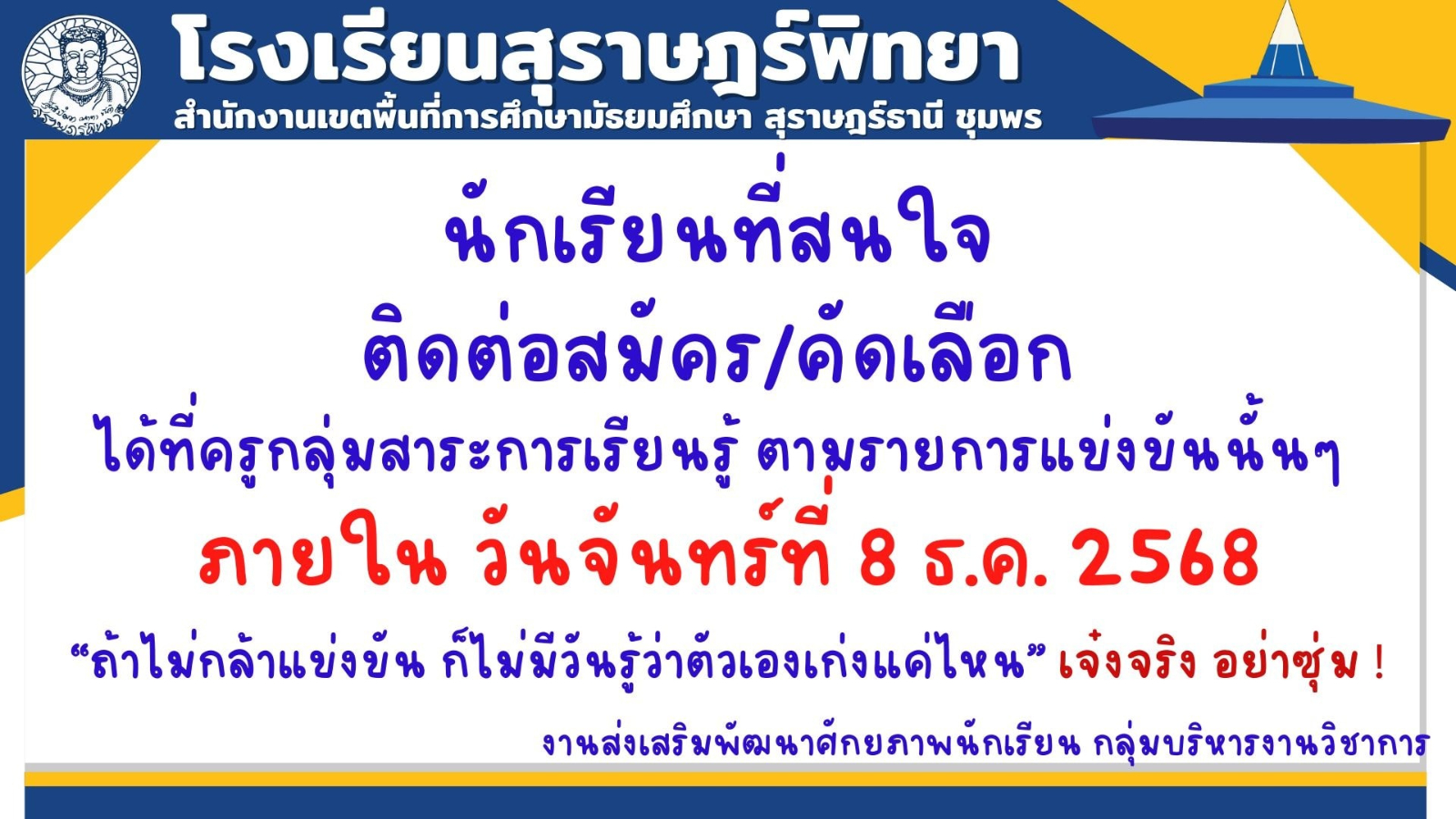 นักเรียนที่สนใจสามารถติดต่อสมัคร/คัดเลือก ได้ที่ครูกลุ่มสาระการเรียนรู้ ตามรายการแข่งขันนั้นๆ ภายในวันจันทร์ที่ 8 ธันวาคม 2568
