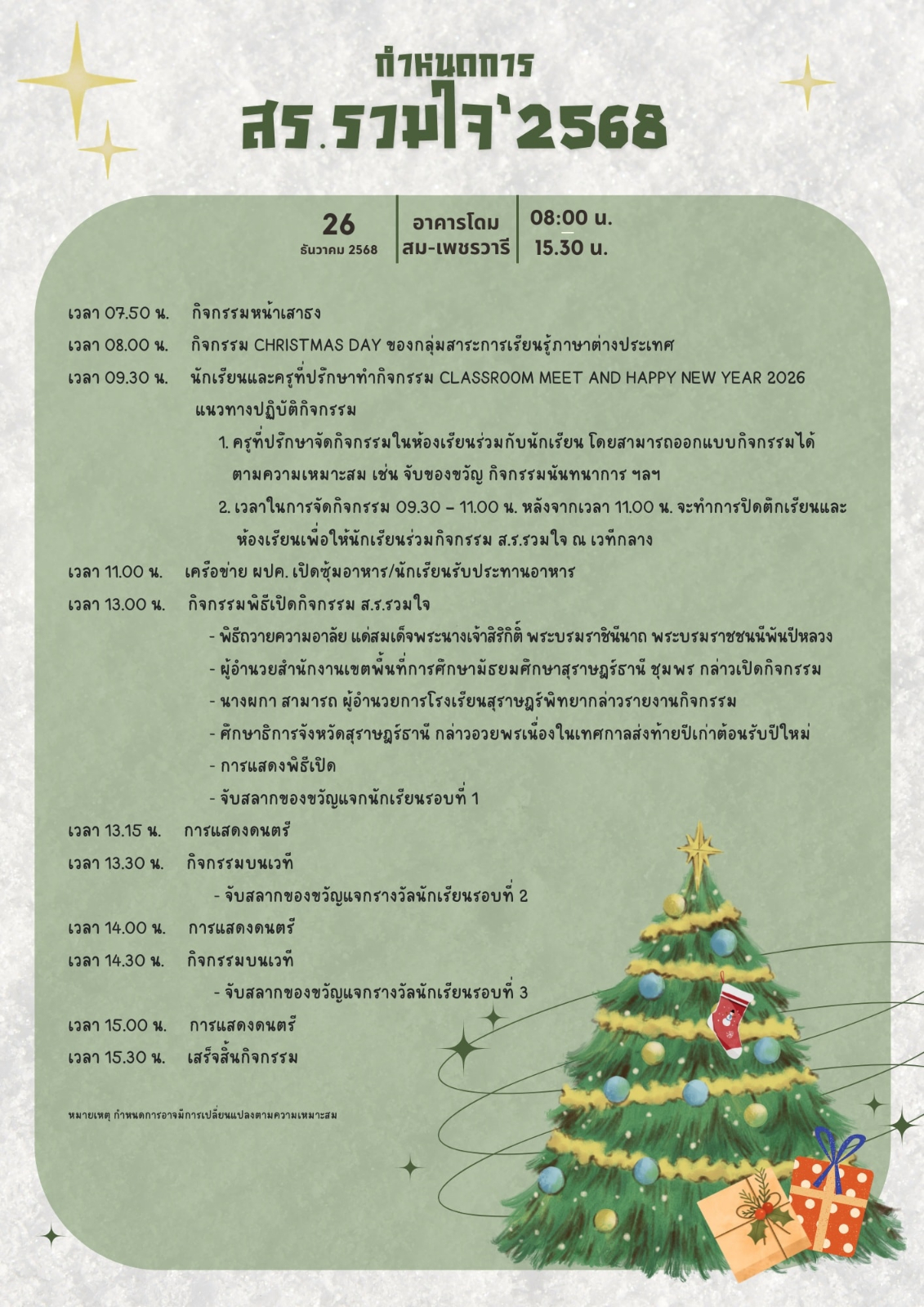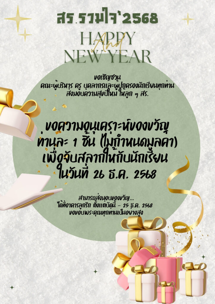 สร. รวมใจ’ 2568 ส่งความสุขปีใหม่ให้ลูก ๆ สร. / ข่าวประชาสัมพันธ์ / By สุธน ภักดี สร. รวมใจ’ 2568 ส่งความสุขปีใหม่ให้ลูก ๆ สร. ขอเชิญชวนทุกท่าน ร่วมส่งต่อความสุขและรอยยิ้มให้กับนักเรียนในกิจกรรมวันปีใหม่ ส่งมอบของขวัญได้ที่อาคารลูกรัก ตั้งแต่วันนี้ – 25 ธันวาคม พ.ศ. 2568ขอขอบพระคุณทุกท่านมา ณ โอกาสนี้ Post Views: 2