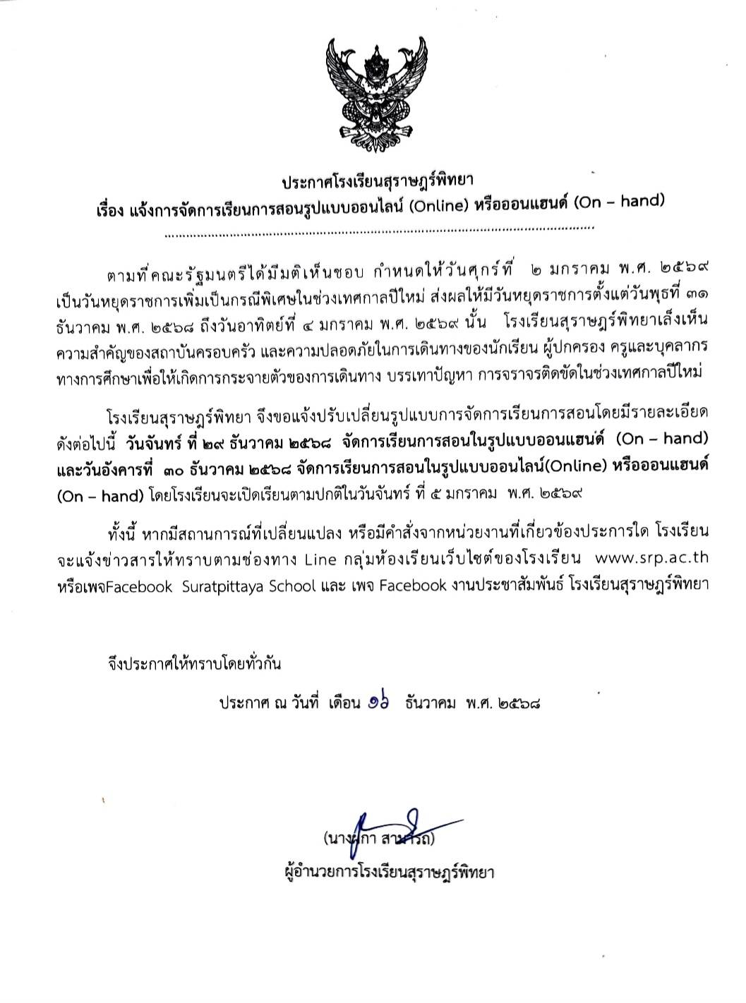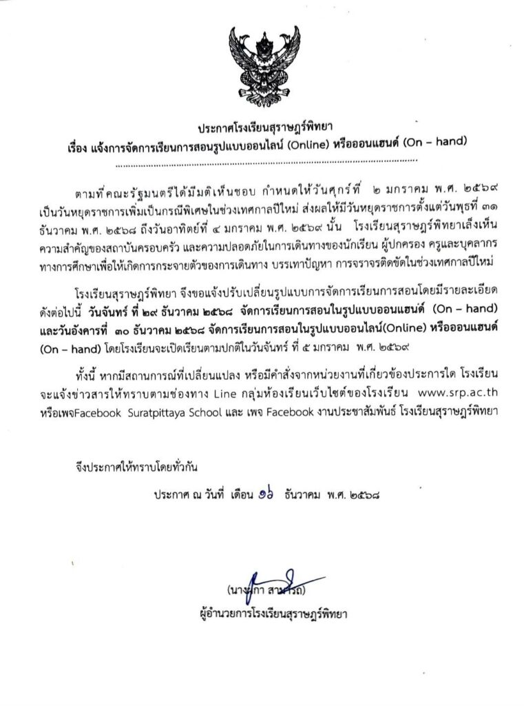 การปรับรูปแบบการจัดการเรียนการสอนในวันที่ 29 – 30 ธันวาคม 2568 / ข่าวประกาศ / By สุธน ภักดี Post Views: 1
