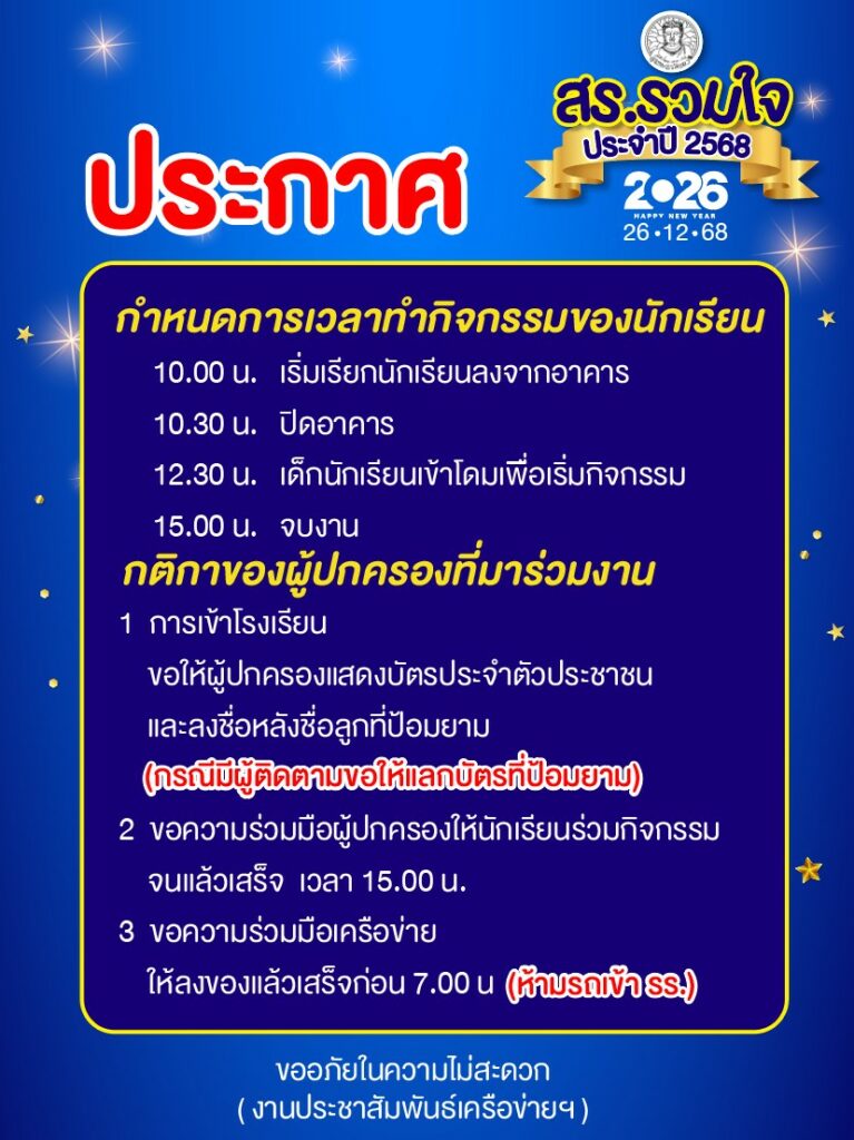 ประกาศกำหนดการเวลาทำกิจกรรมของนักเรียน สร.รวมใจ ประจำปี 2568 / ข่าวประกาศ / By สุธน ภักดี Post Views: 3