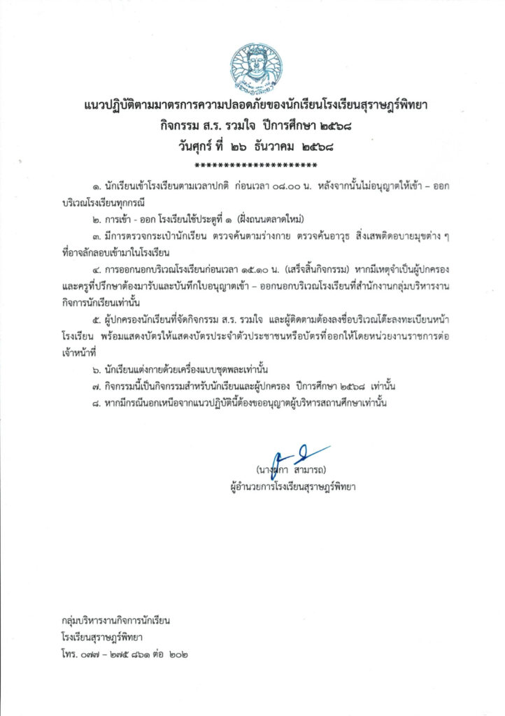 แนวปฏิบัติมาตรการความปลอดภัยของนักเรียนโรงเรียนสุราษฎร์พิทยา กิจกรรม ส.ร. รวมใจ ปีการศึกษา 2568 / ข่าวประกาศ / By สุธน ภักดี Post Views: 6