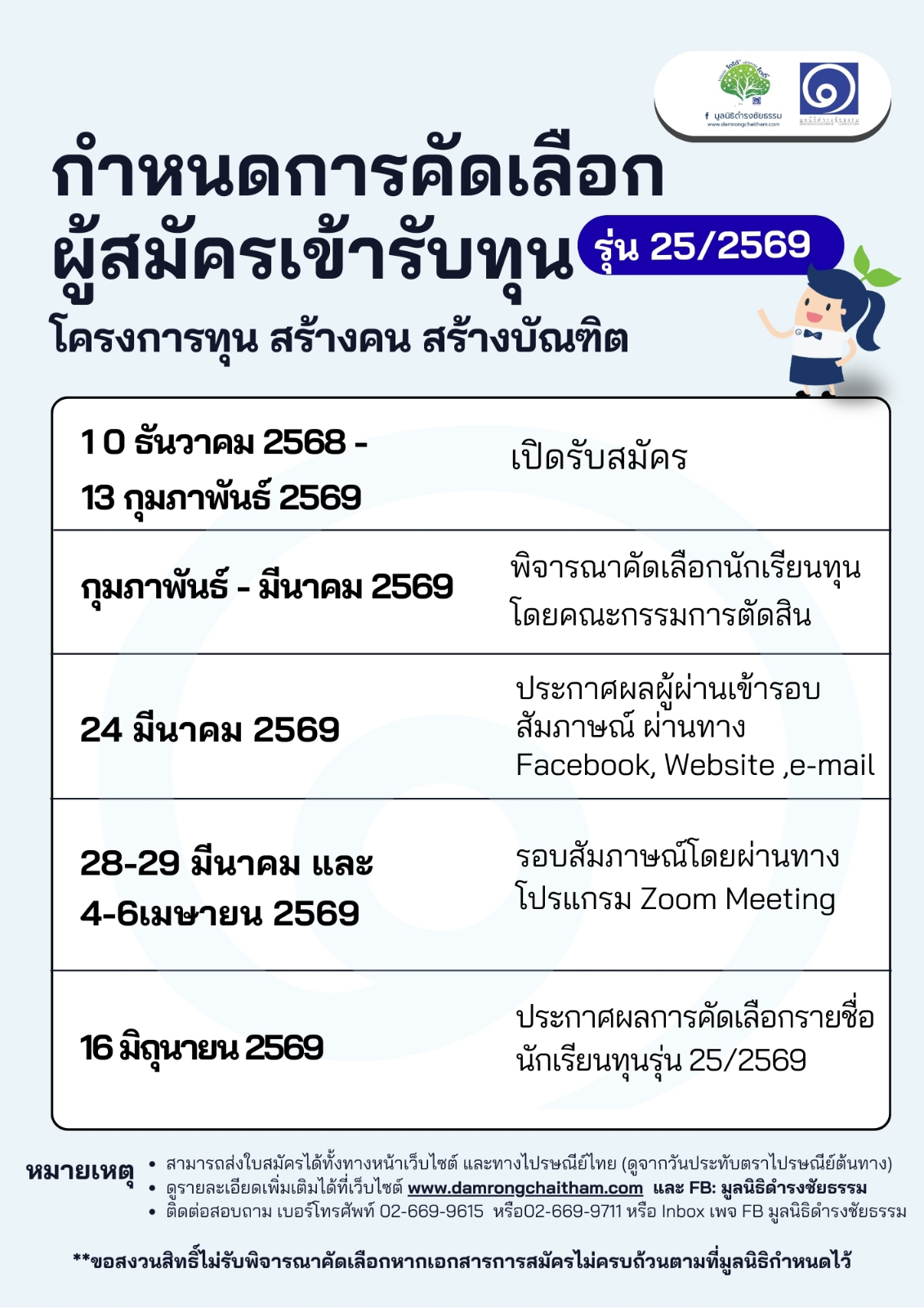 โครงการ “ทุนสร้างคน สร้างบัณฑิต รุ่นที่ 25/2569” เปิดรับสมัครนักเรียนทุนตั้งแต่วันนี้ ถึง 13 กุมภาพันธ์ 2569