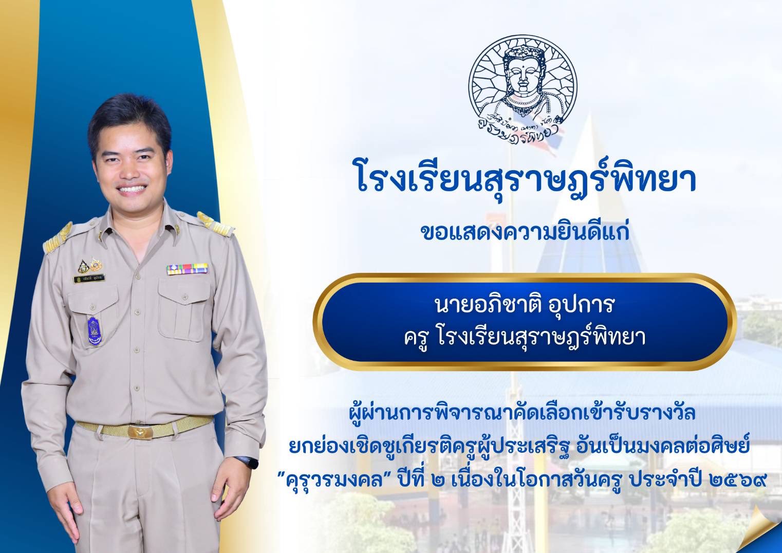 ขอแสดงความยินดีกับครู รับรางวัลยกย่องเชิดชูเกียรติครูผู้ประเสริฐ “คุรุวรมงคล” ปีที่ 2 / ผลงานดีเด่น / By สุธน ภักดี โรงเรียนสุราษฎร์พิทยา ขอแสดงความยินดีกับครูโรงเรียนสุราษฎร์พิทยาทั้ง 4 ท่าน ที่ได้รับคัดเลือกเข้ารับรางวัลยกย่องเชิดชูเกียรติครูผู้ประเสริฐ “คุรุวรมงคล” ปีที่ 2 เนื่องในโอกาสวันครู พ.ศ. 2569 Post Views: 3