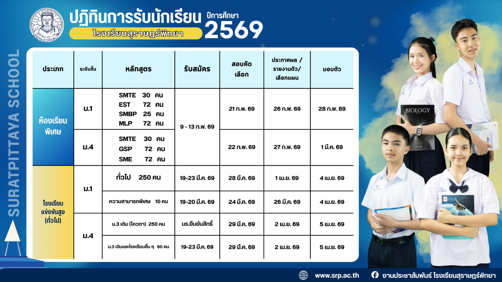 ปฏิทินรับนักเรียน โรงเรียนสุราษฎร์พิทยา ปีการศึกษา 2569 / ข่าวประชาสัมพันธ์, โครงการห้องเรียนพิเศษ, โรงเรียนแข่งขันสูง / By สุธน ภักดี ห้องเรียนโครงการพิเศษ http://202.129.29.138/ict/specialprojectห้องเรียนทั่วไป http://202.129.29.138/ict/exam Post Views: 319