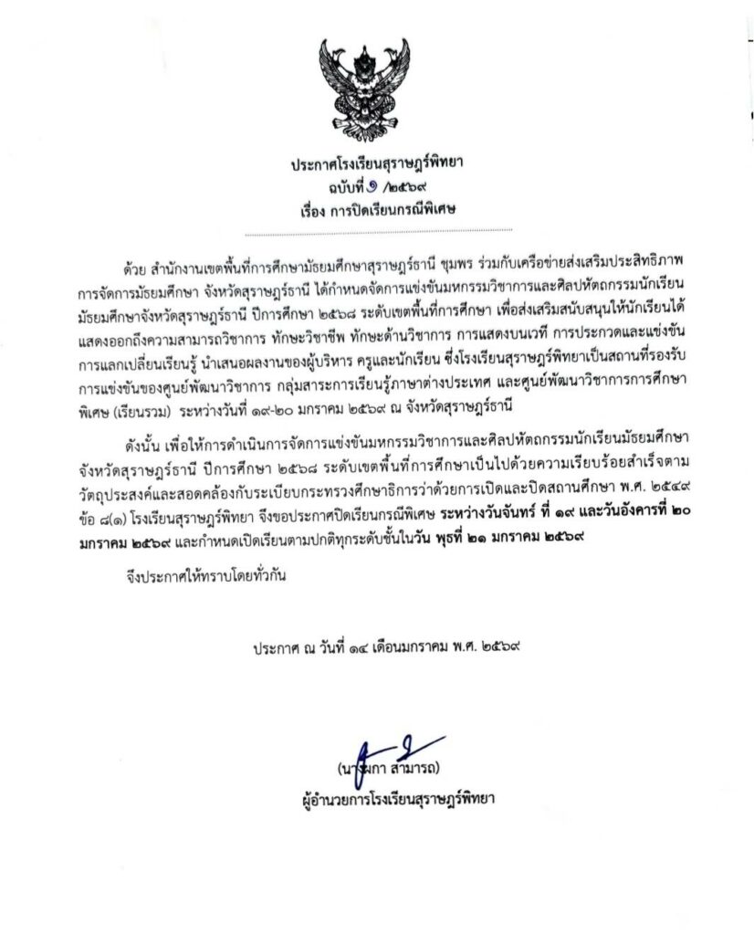ปิดเรียนกรณีพิเศษ วันที่ 19 และ 20 มกราคม 2569 / ข่าวประกาศ / By สุธน ภักดี ประกาศโรงเรียนสุราษฎร์พิทยา ปิดเรียนกรณีพิเศษ วันจันทร์ที่ 19 มกราคม พ.ศ. 2569 และวันอังคารที่ 20 มกราคม พ.ศ. 2569 และกำหนดเปิดเรียนตามปกติทุกระดับชั้น ในวันพุธที่ 21 มกราคม พ.ศ. 2569 Post Views: 9