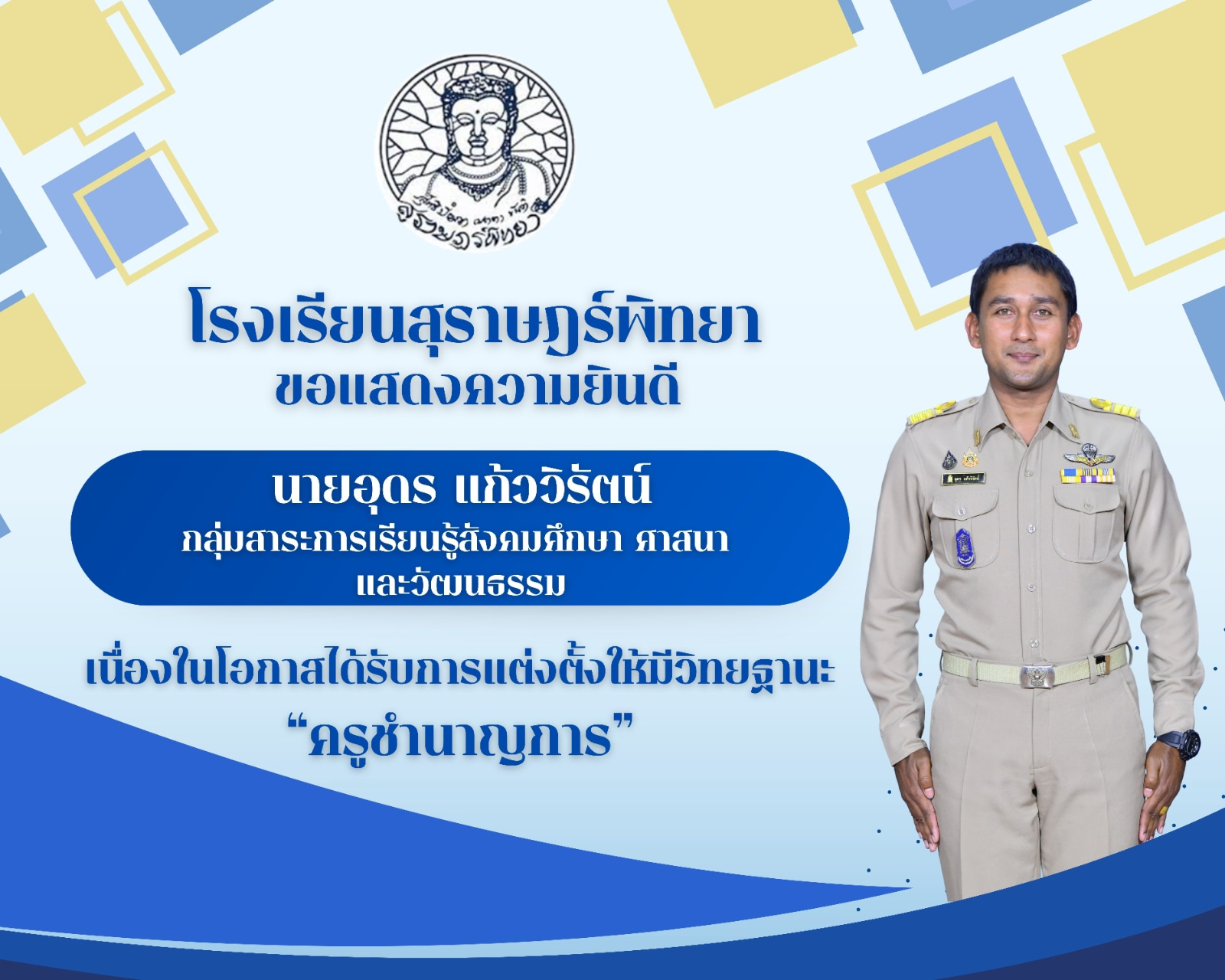 ครูโรงเรียนสุราษฎร์พิทยา ได้รับการเลื่อนวิทยฐานะและได้รับการแต่งตั้งให้มีวิทยฐานะ / ข่าวประชาสัมพันธ์ / By สุธน ภักดี ขอแสดงความยินดีกับครูโรงเรียนสุราษฎร์พิทยาทั้ง 3 ท่าน เนื่องในโอกาสที่ได้รับการเลื่อนวิทยฐานะและได้รับการแต่งตั้งให้มีวิทยฐานะ Post Views: 1
