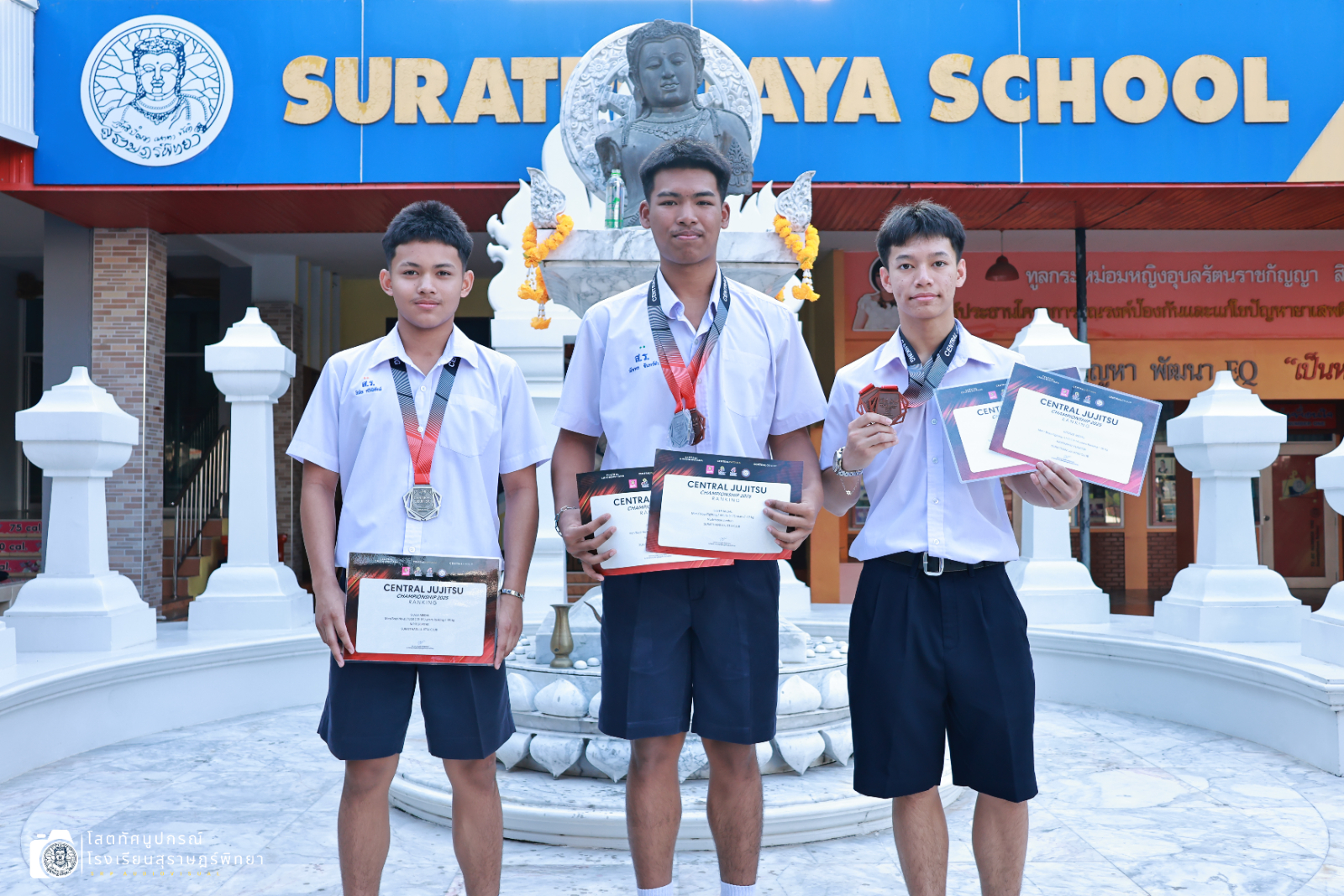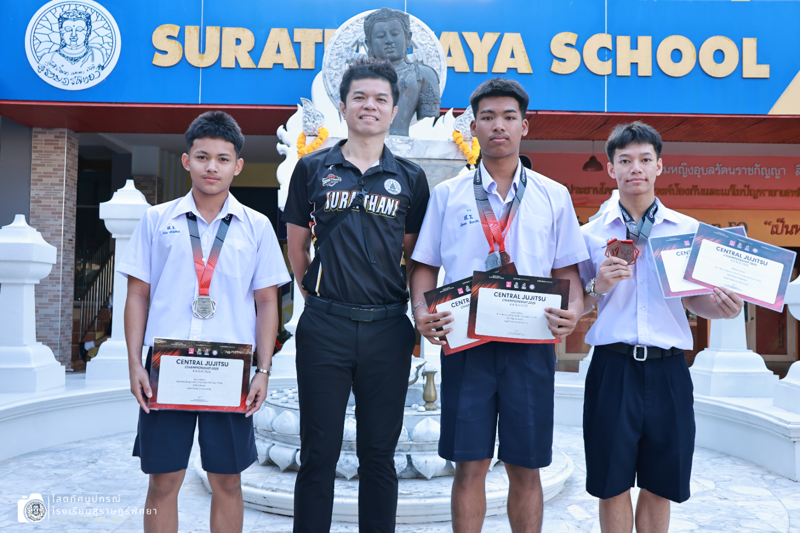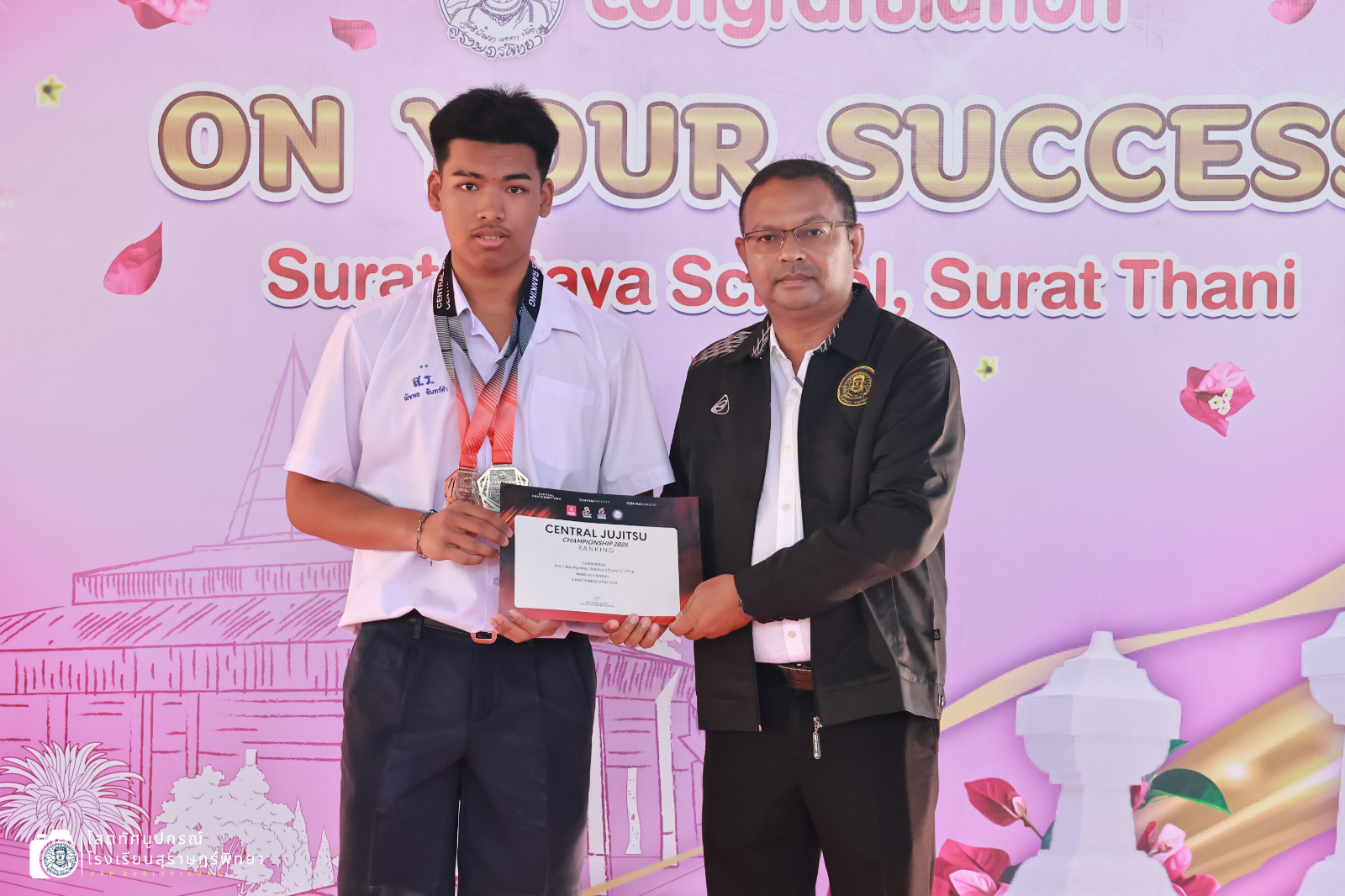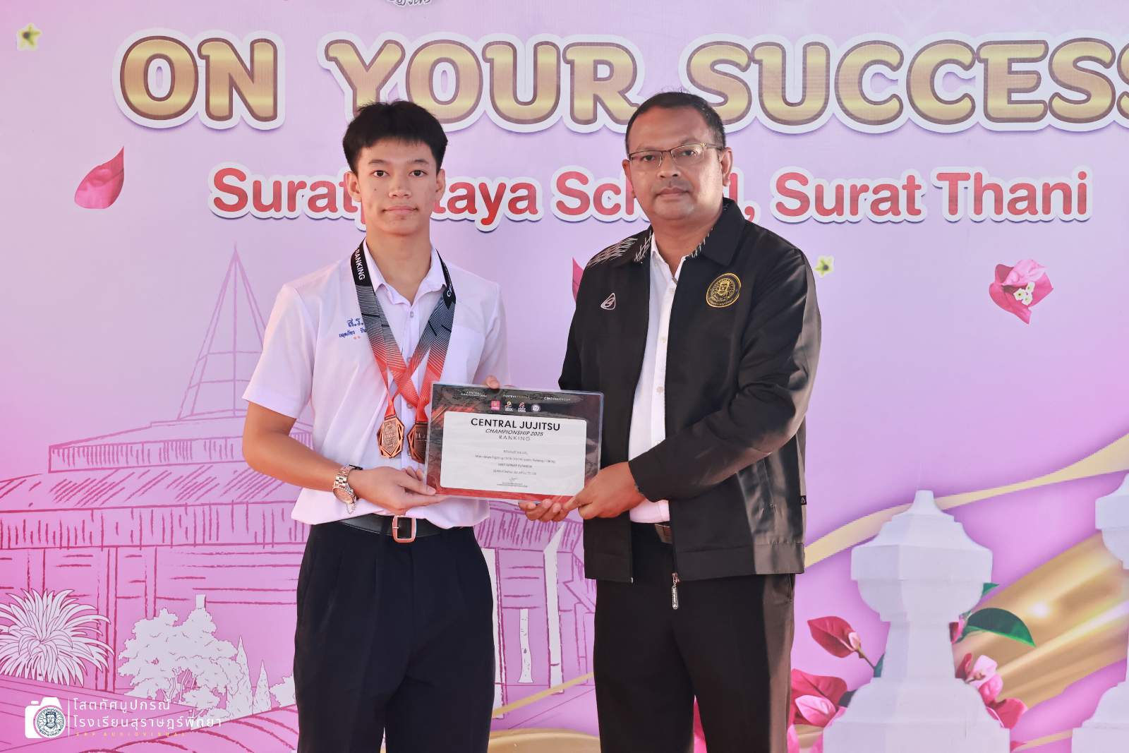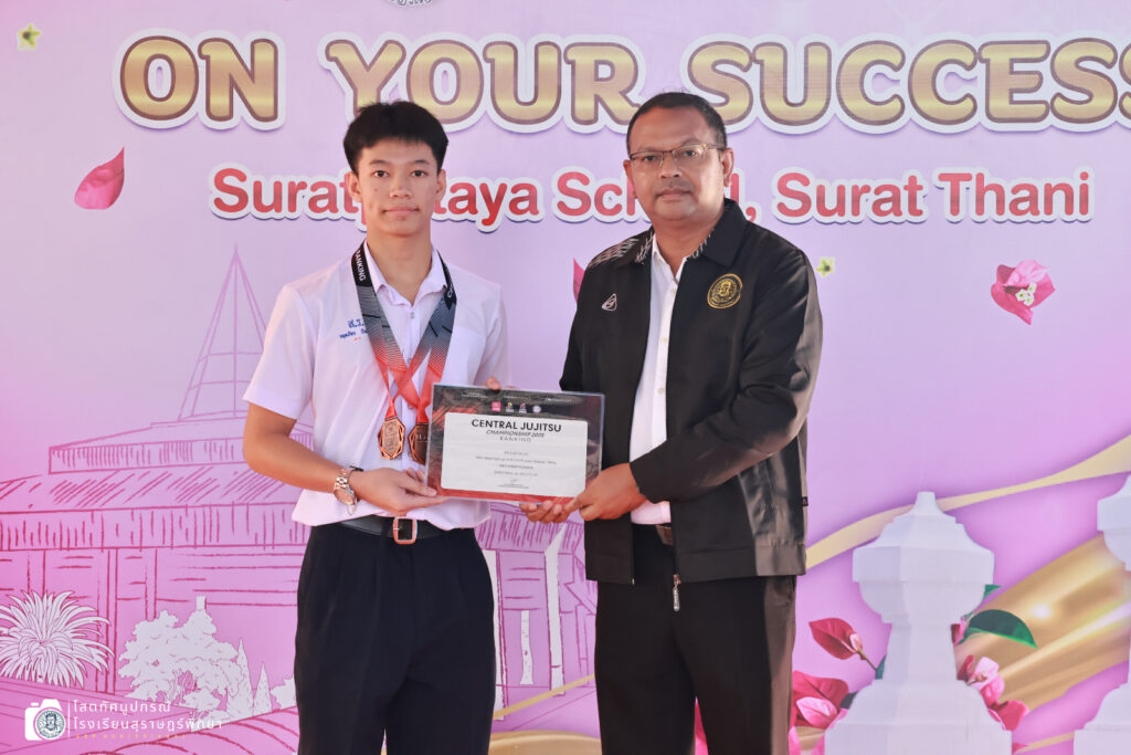 นายอภิชาติ ศรีทองสม รองผู้อำนวยการกลุ่มบริหารงานทั่วไป มอบเกียรติบัตรและเหรียญรางวัลแก่ตัวแทนนักเรียนกลุ่มสาระการเรียนรู้สุขศึกษาและพลศึกษา อาคารสม-เพชรวารี โรงเรียนสุราษฎร์พิทยา