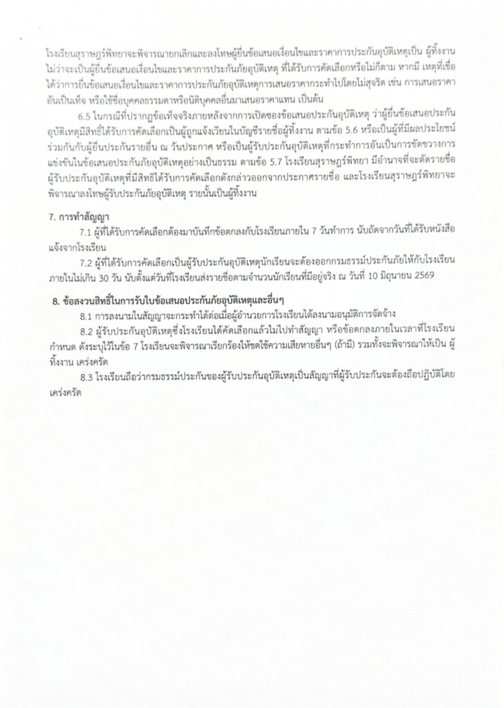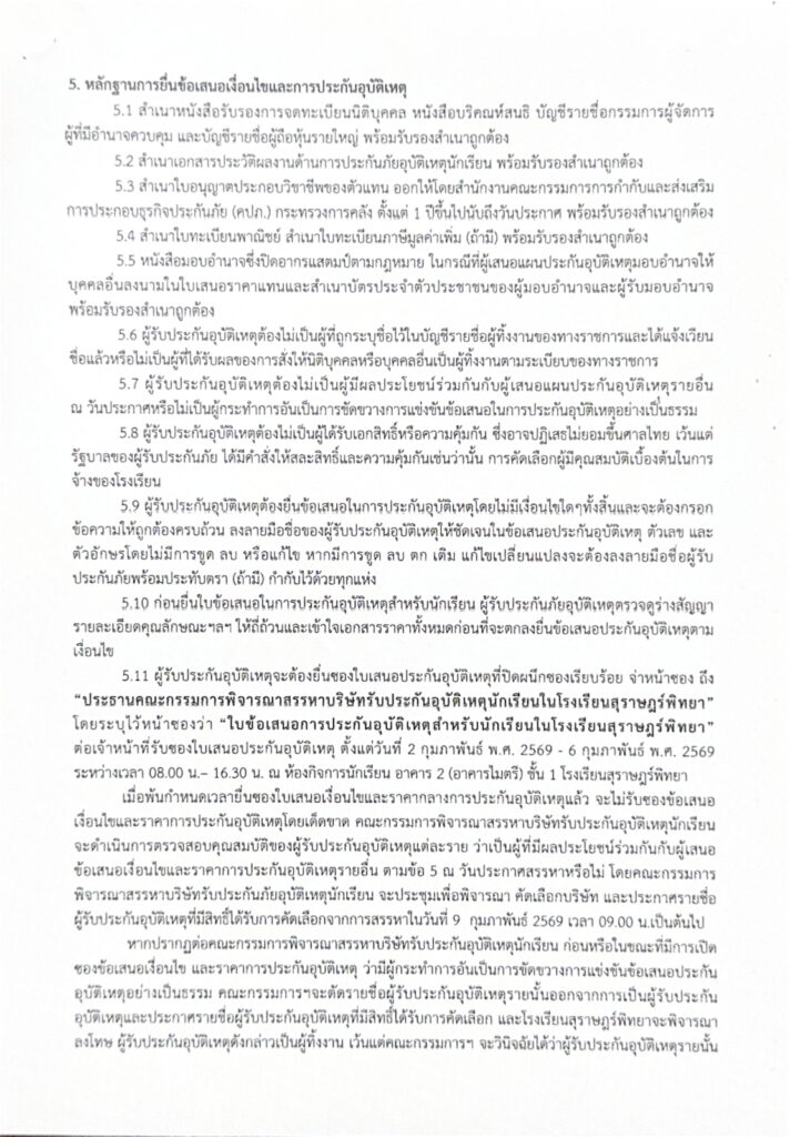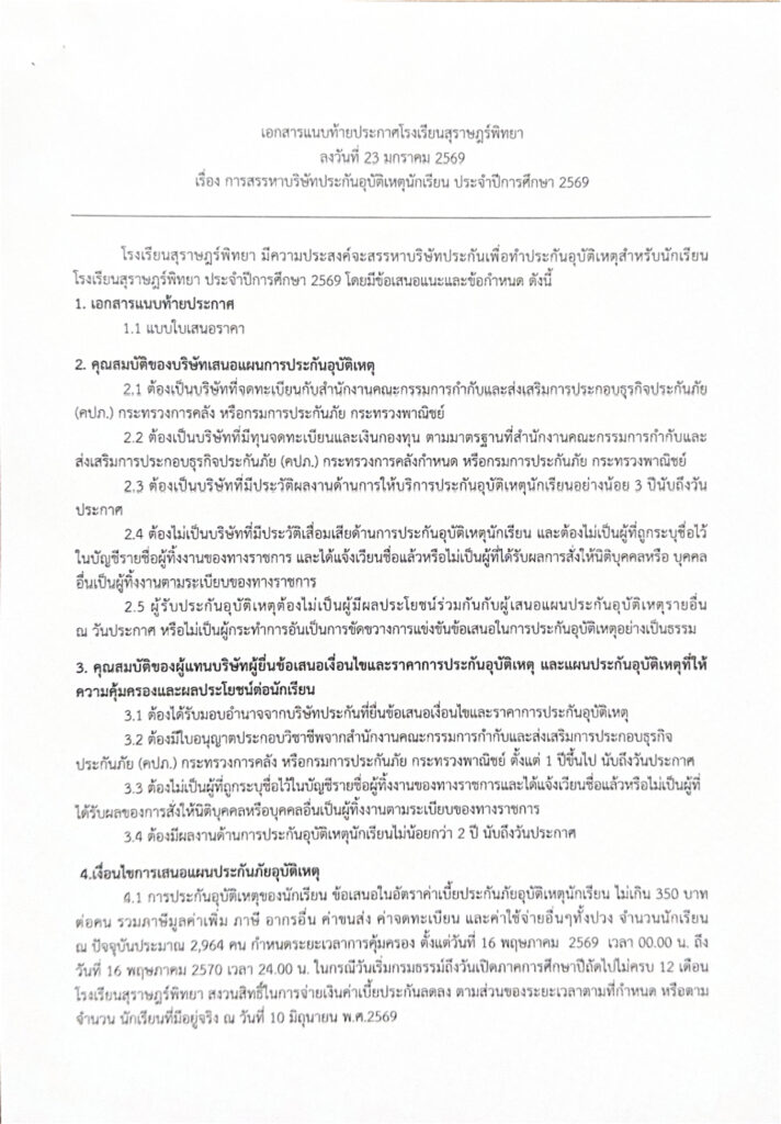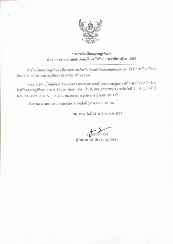 การสรรหาบริษัทประกันอุบัติเหตุนักเรียน ประจำปีการศึกษา 2569 / ข่าวประกาศ / By สุธน ภักดี ประกาศโรงเรียนสุราษฎร์พิทยา เรื่อง การสรรหาบริษัทประกันอุบัติเหตุนักเรียน ประจำปีการศึกษา 2569 เอกสาร ดังนี้ 1. ประกาศโรงเรียนสุราษฎร์พิทยา2. เอกสารแนบท้ายประกาศโรงเรียนสุราษฎร์พิทยา Post Views: 2