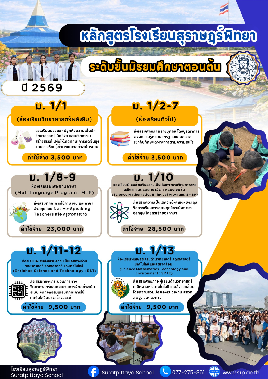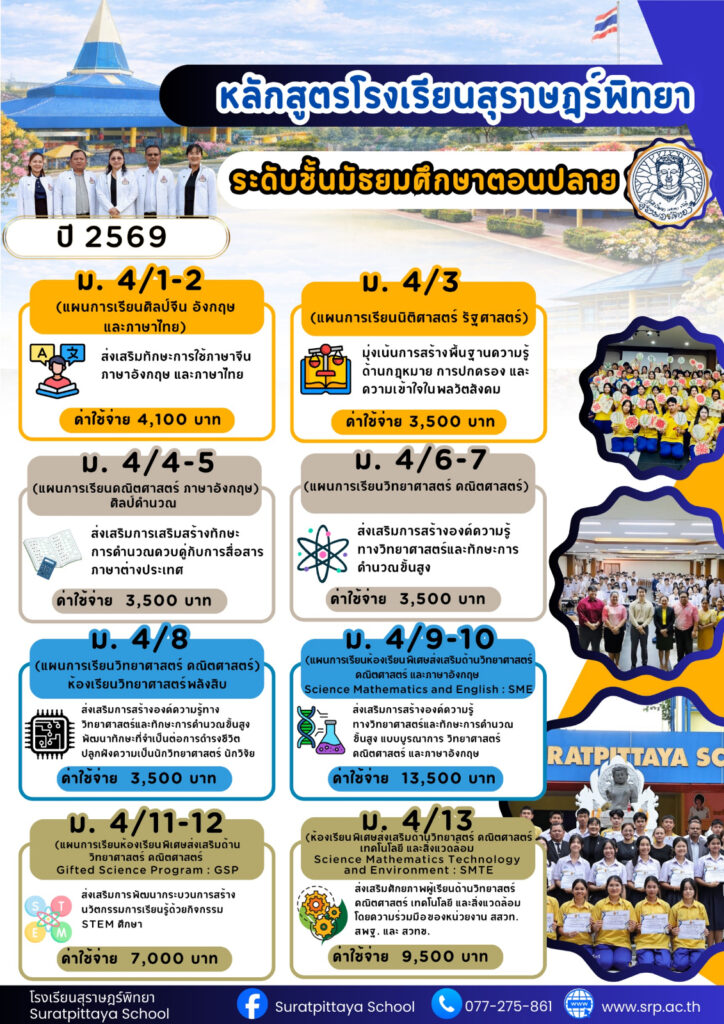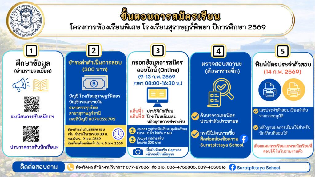 ขั้นตอนการสมัครและหลักสูตรโรงเรียนสุราษฎร์พิทยา ปีการศึกษา 2569 / ข่าวประชาสัมพันธ์, โครงการห้องเรียนพิเศษ, โรงเรียนแข่งขันสูง / By สุธน ภักดี ขั้นตอนการสมัครและหลักสูตรโรงเรียนสุราษฎร์พิทยา ปีการศึกษา 2569 ระดับชั้นมัธยมศึกษาตอนต้น และระดับชั้นมัธยมศึกษาตอนปลาย Post Views: 2