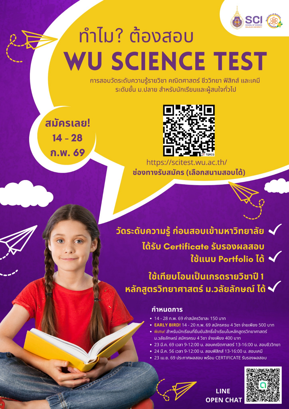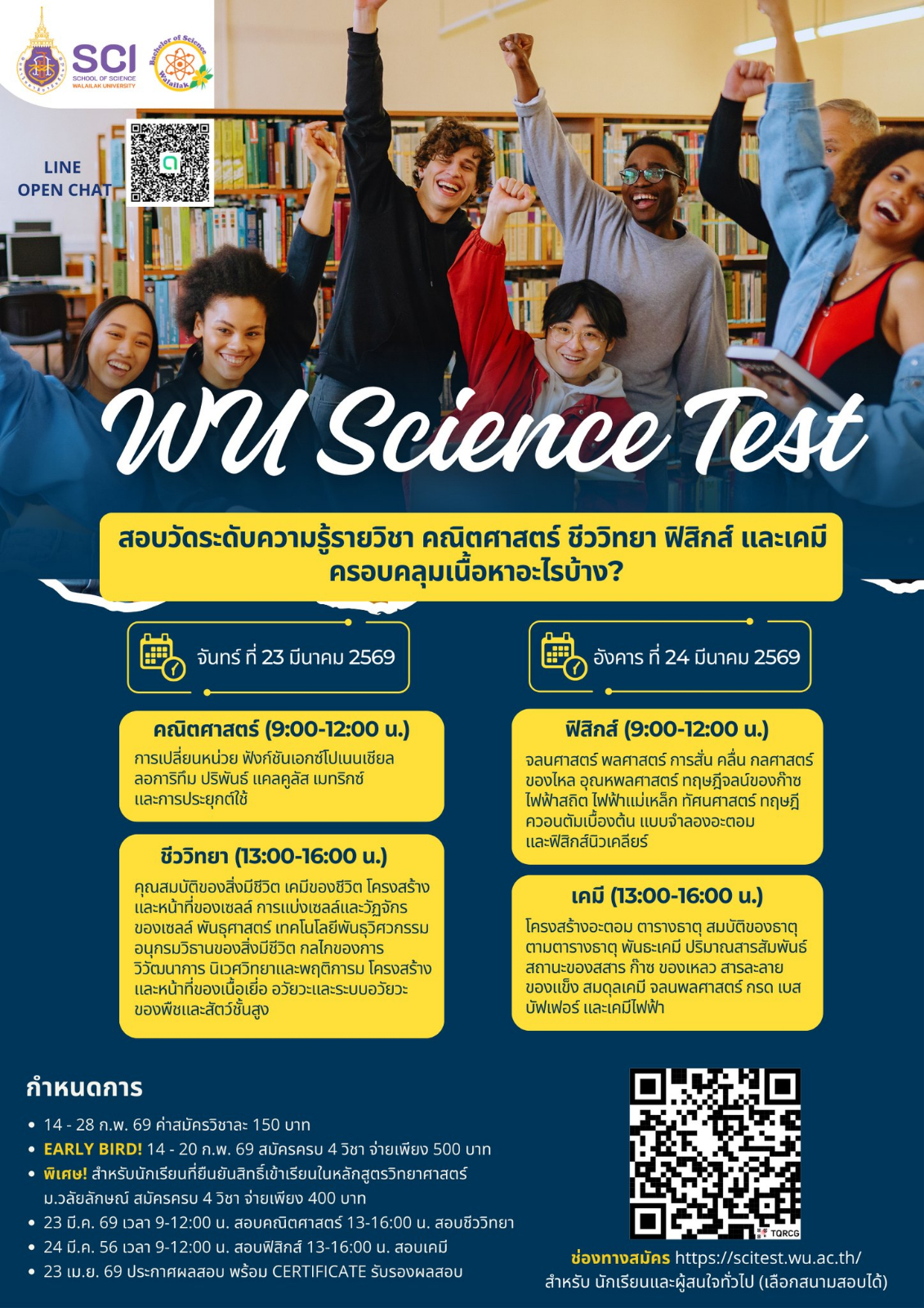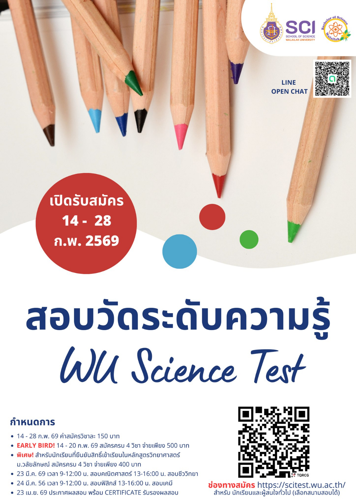 ช่องทางรับสมัคร (เลือกสนามสอบได้) https://scitest.wu.ac.th/