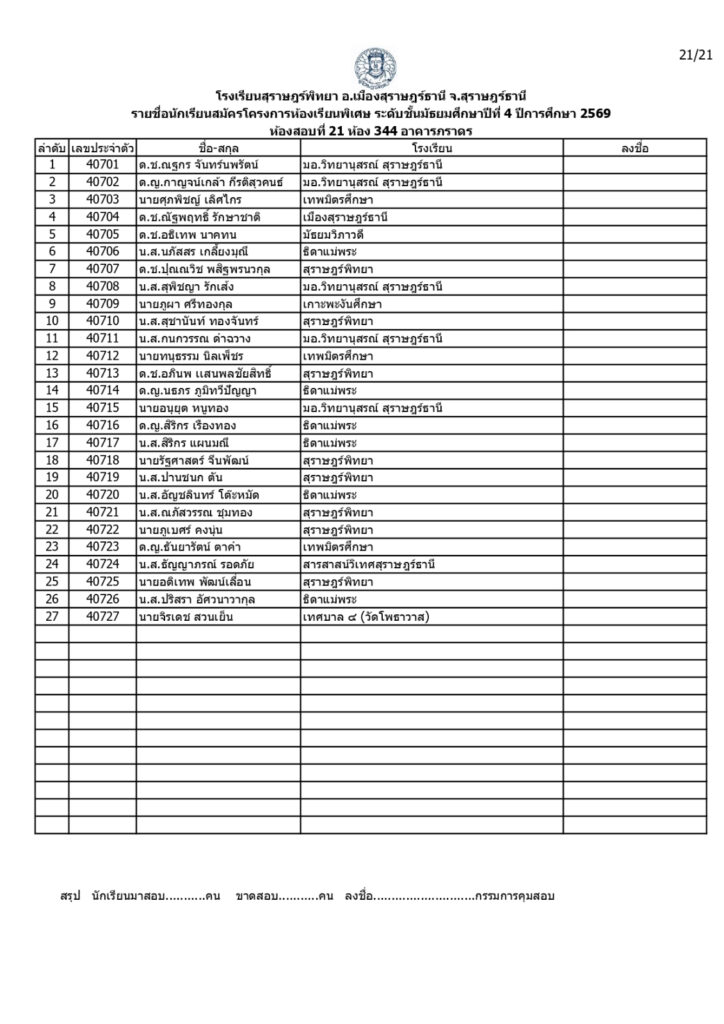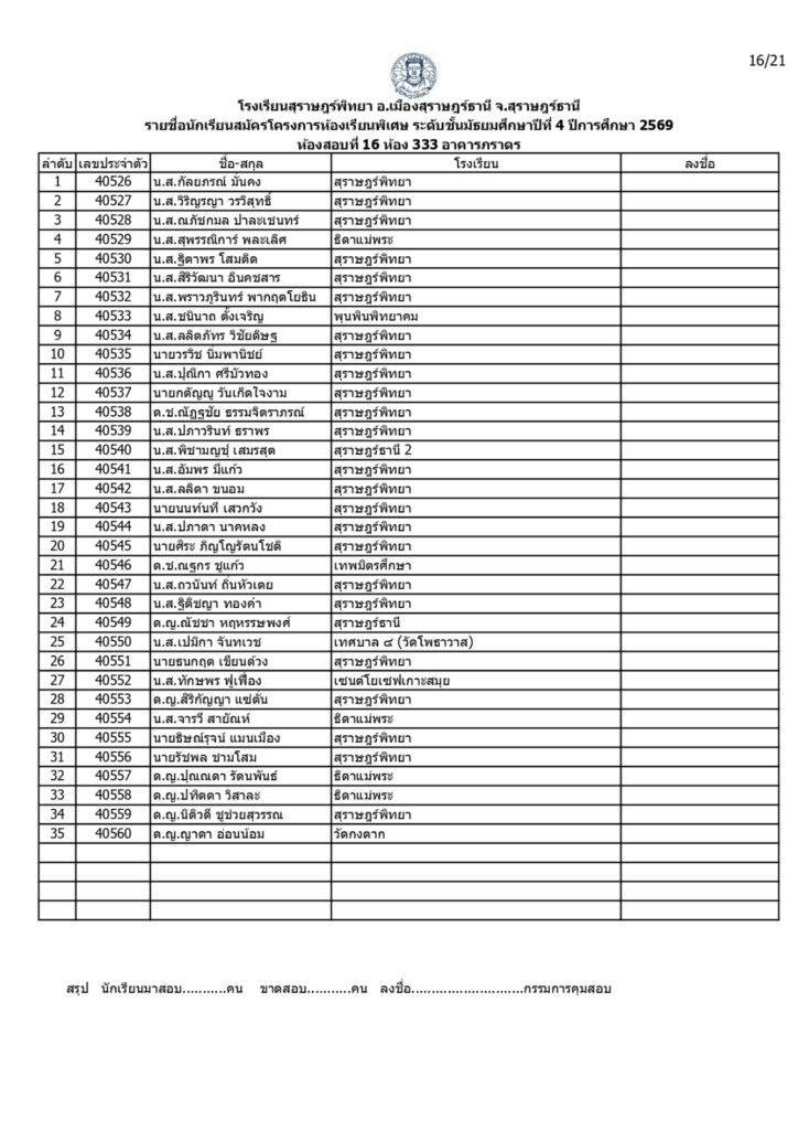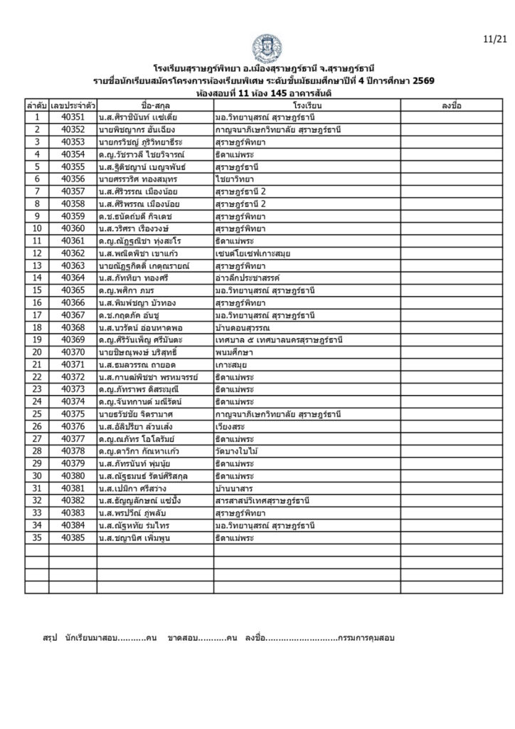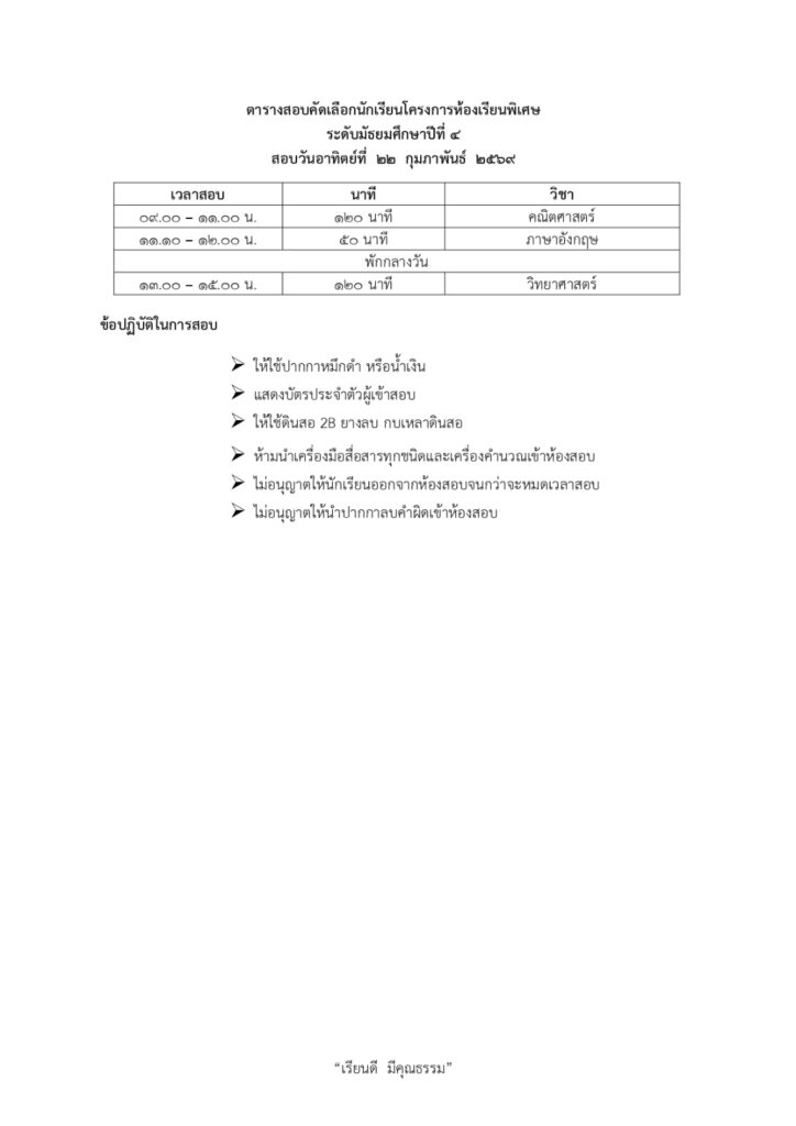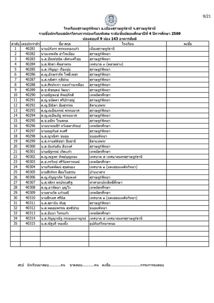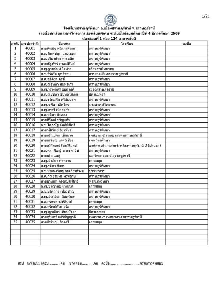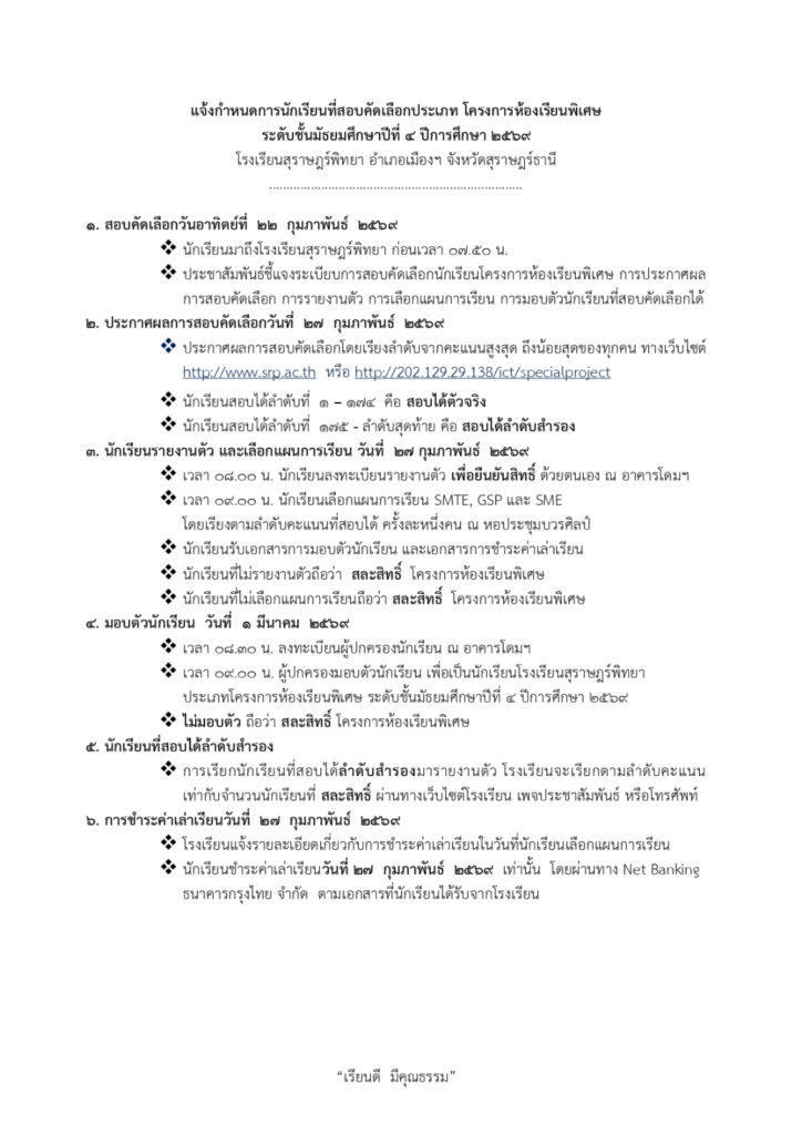 ประกาศรายชื่อผู้มีสิทธิ์สอบคัดเลือกเข้าเรียนโครงการห้องเรียนพิเศษโรงเรียนสุราษฎร์พิทยาระดับชั้นมัธยมศึกษาปีที่ 4 ปีการศึกษา 2569 / ข่าวประกาศ, โครงการห้องเรียนพิเศษ / By สุธน ภักดี Post Views: 12