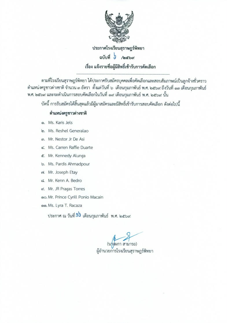 แจ้งรายชื่อผู้มีสิทธิ์เข้ารับการคัดเลือก ตำแหน่งครูชาวต่างชาติ / ข่าวประกาศ / By สุธน ภักดี Post Views: 9