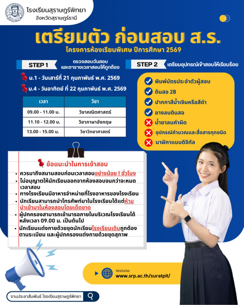 เตรียมตัวให้พร้อมสำหรับการสอบคัดเลือกโครงการห้องเรียนพิเศษ ปีการศึกษา 2569 / ข่าวประชาสัมพันธ์, โครงการห้องเรียนพิเศษ / By สุธน ภักดี เตรียมตัวให้พร้อมสำหรับการสอบคัดเลือกโครงการห้องเรียนพิเศษ โรงเรียนสุราษฎร์พิทยา ปีการศึกษา 2569ตรวจสอบข้อมูล และอุปกรณ์ในการเข้าสอบให้พร้อมก่อนวันสอบ พิมพ์บัตรประจำตัวคลิกที่นี่ Post Views: 4