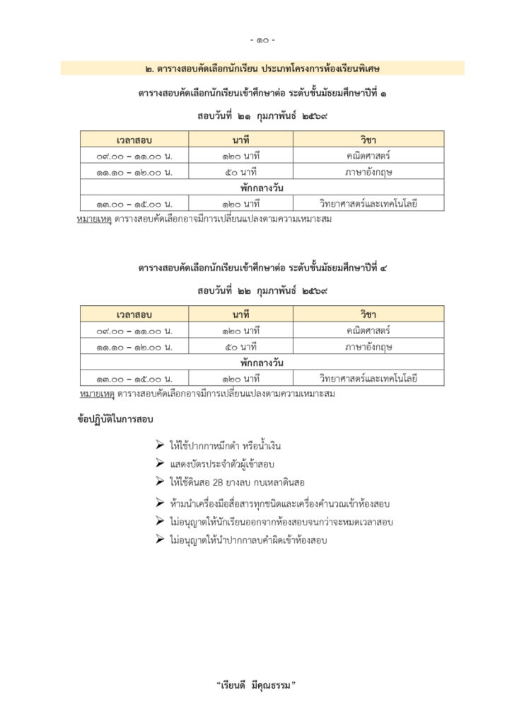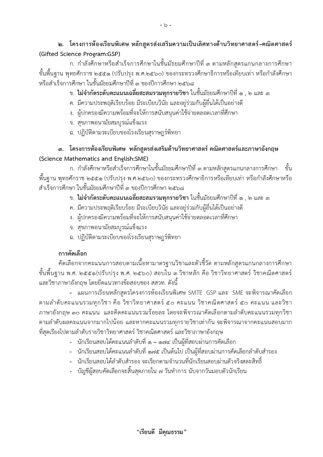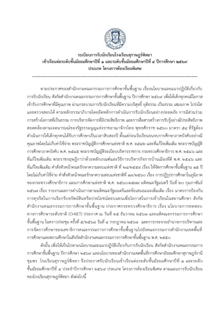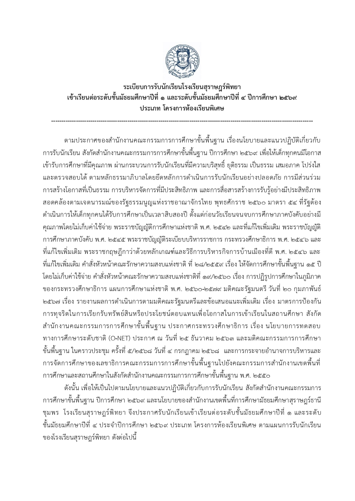 ระเบียบการรับนักเรียนเข้าเรียนต่อ ม.1 และม.4 ปีการศึกษา 2569 ประเภท โครงการห้องเรียนพิเศษ / ข่าวประกาศ, โครงการห้องเรียนพิเศษ / By สุธน ภักดี หมายเหตุ ยกเลิกประกาศฉบับเดิม เนื่องจากเปลี่ยนเวลาประกาศผลทุกประเภทเป็น 07.30 น. Post Views: 12