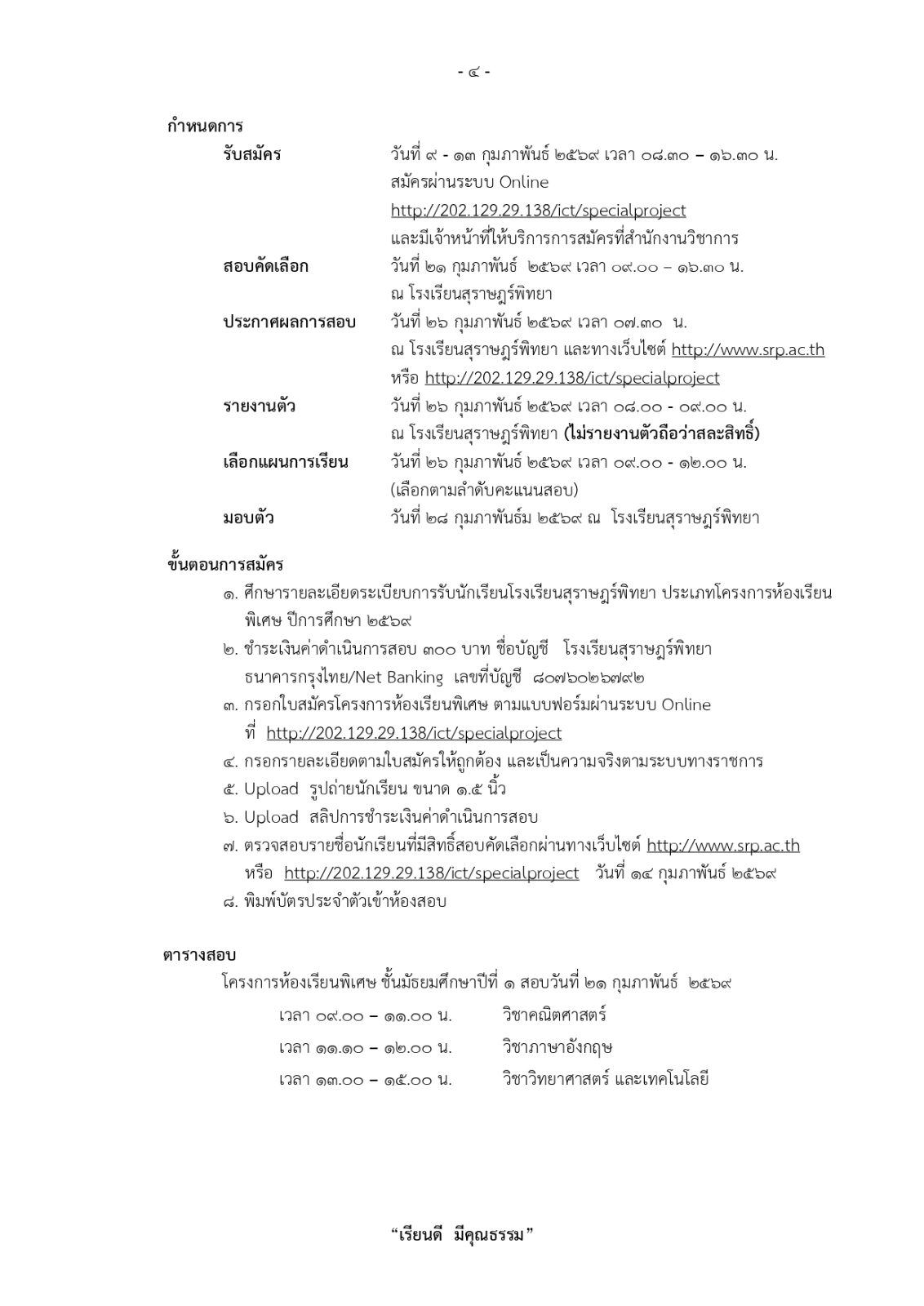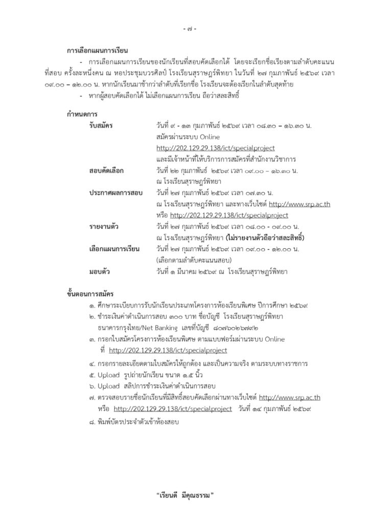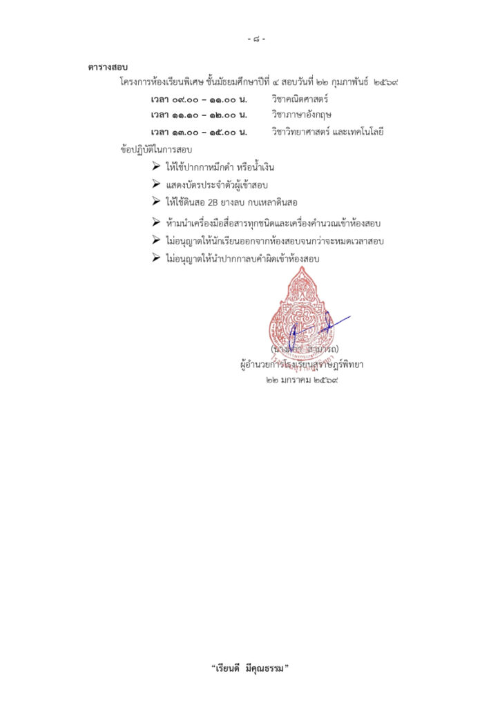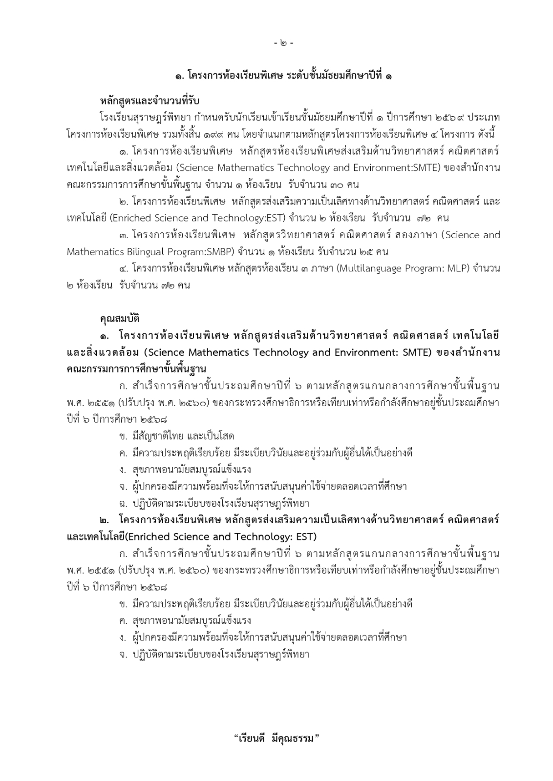 ระเบียบการรับนักเรียนเข้าเรียนต่อ ม.1 และม.4 ปีการศึกษา 2569 ประเภท โครงการห้องเรียนพิเศษ / ข่าวประกาศ, โครงการห้องเรียนพิเศษ / By สุธน ภักดี หมายเหตุ ยกเลิกประกาศฉบับเดิม เนื่องจากเปลี่ยนเวลาประกาศผลทุกประเภทเป็น 07.30 น. Post Views: 12