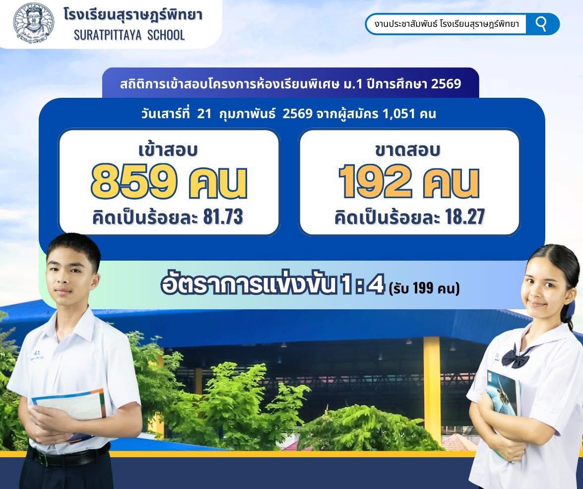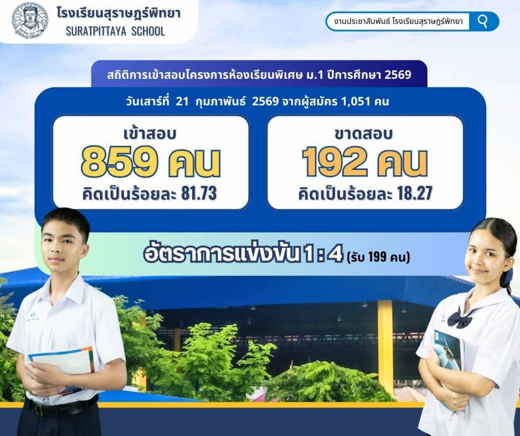 สถิติการเข้าสอบโครงการห้องเรียนพิเศษ ม.1 ปีการศึกษา 2569 / ข่าวประชาสัมพันธ์, โครงการห้องเรียนพิเศษ / By สุธน ภักดี สถิติการเข้าสอบโครงการห้องเรียนพิเศษ ม.1 ปีการศึกษา 2569 วันเสาร์ที่ 21 กุมภาพันธ์ 2569ผู้เข้าสอบ 859 คนขาดสอบ 192 คนอัตราการแข่งขันโดยประมาณ 1:4 คน Post Views: 98