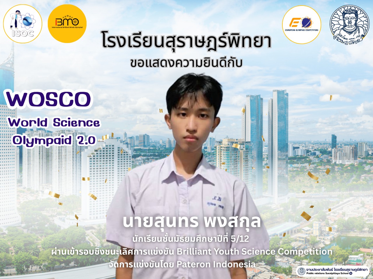 นายสุนทร พงสกุล ผ่านเข้ารอบชิงชนะเลิศ Brilliant Youth Science Competition / ผลงานดีเด่น / By สุธน ภักดี โรงเรียนสุราษฎร์พิทยา ขอแสดงความยินดีกับ นายสุนทร พงสกุล นักเรียนชั้นมัธยมศึกษาปีที่ 5/12 ที่ผ่านเข้ารอบชิงชนะเลิศ การแข่งขัน Brilliant Youth Science Competition จัดการแข่งขันโดย Pateron Indonesia Post Views: 25