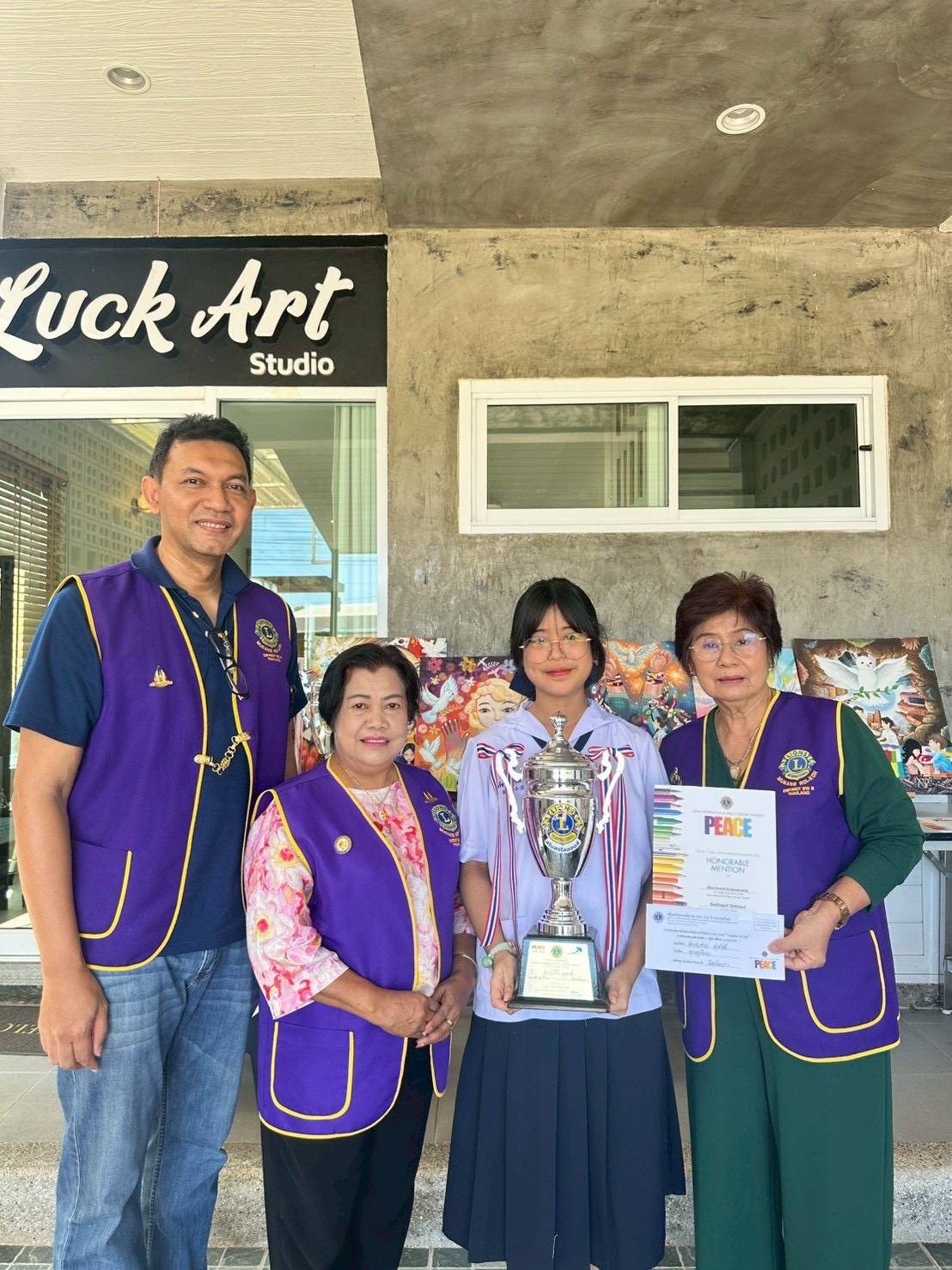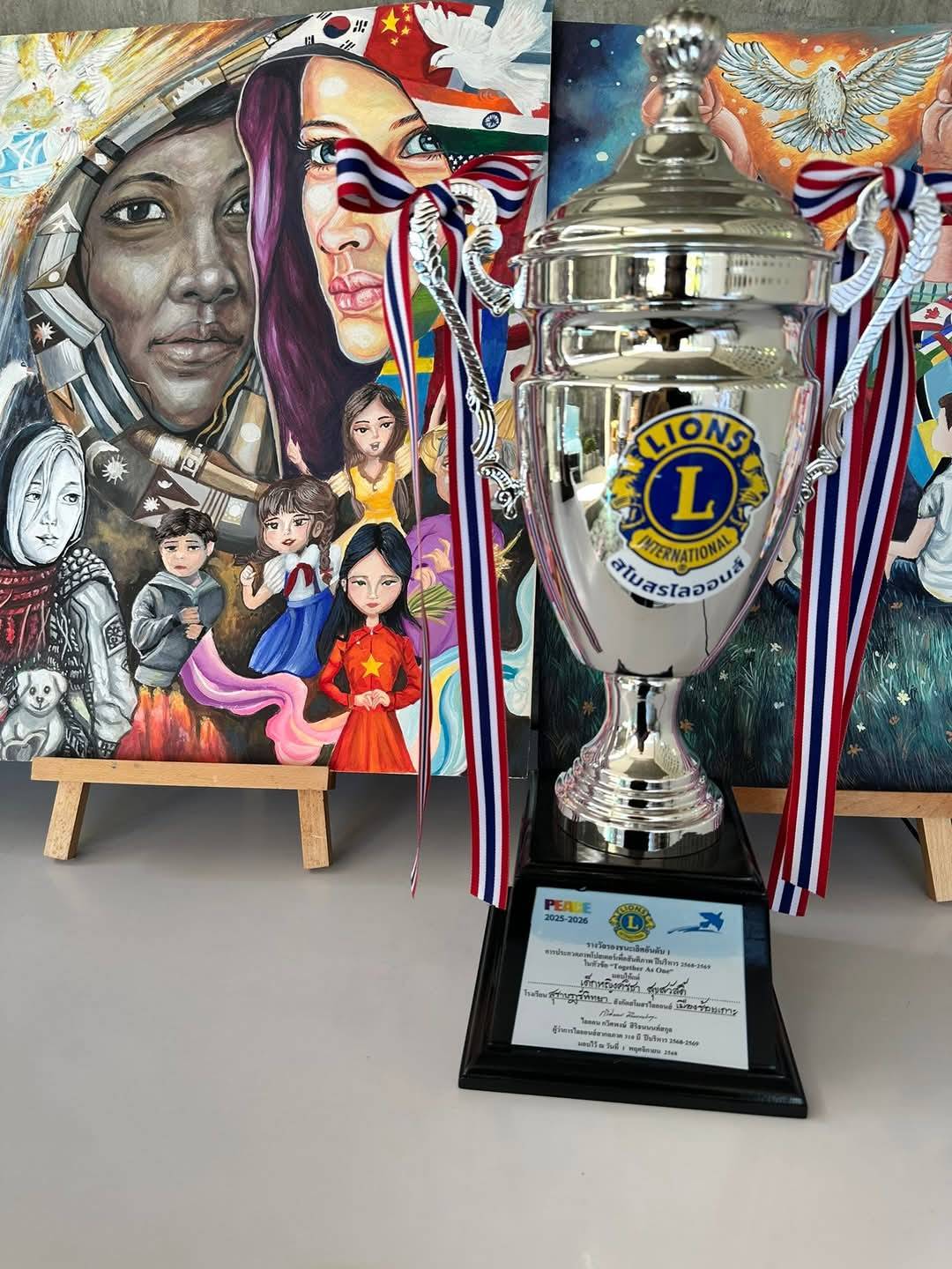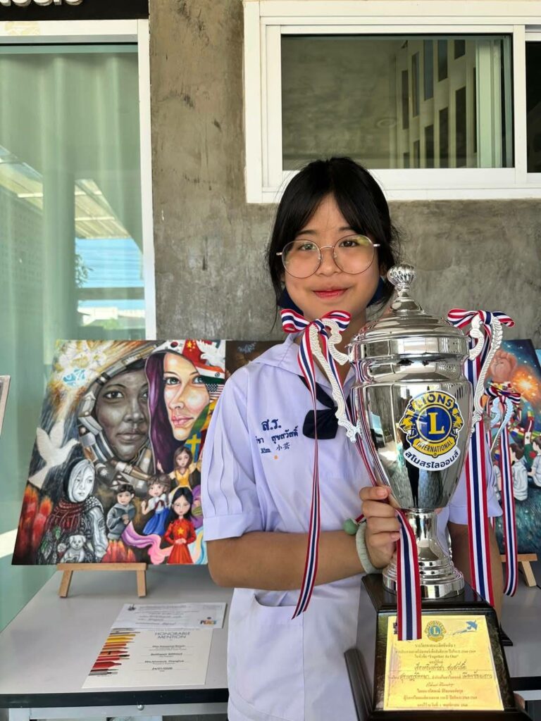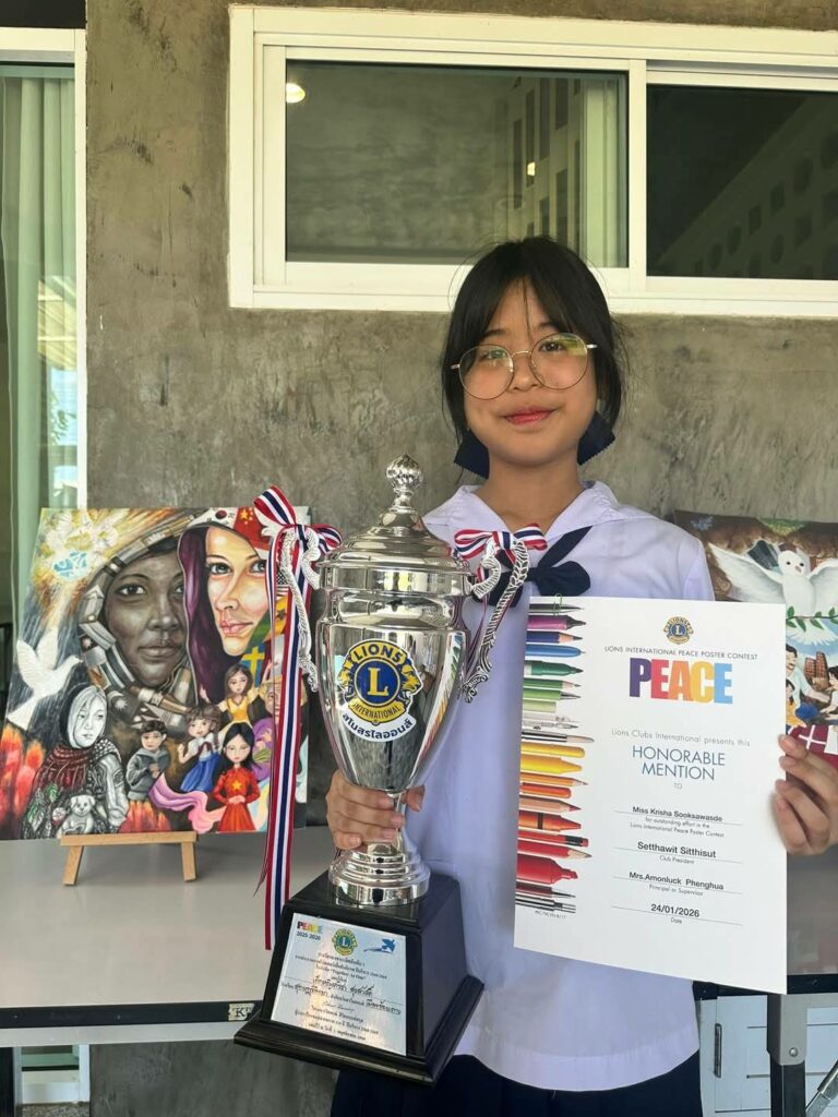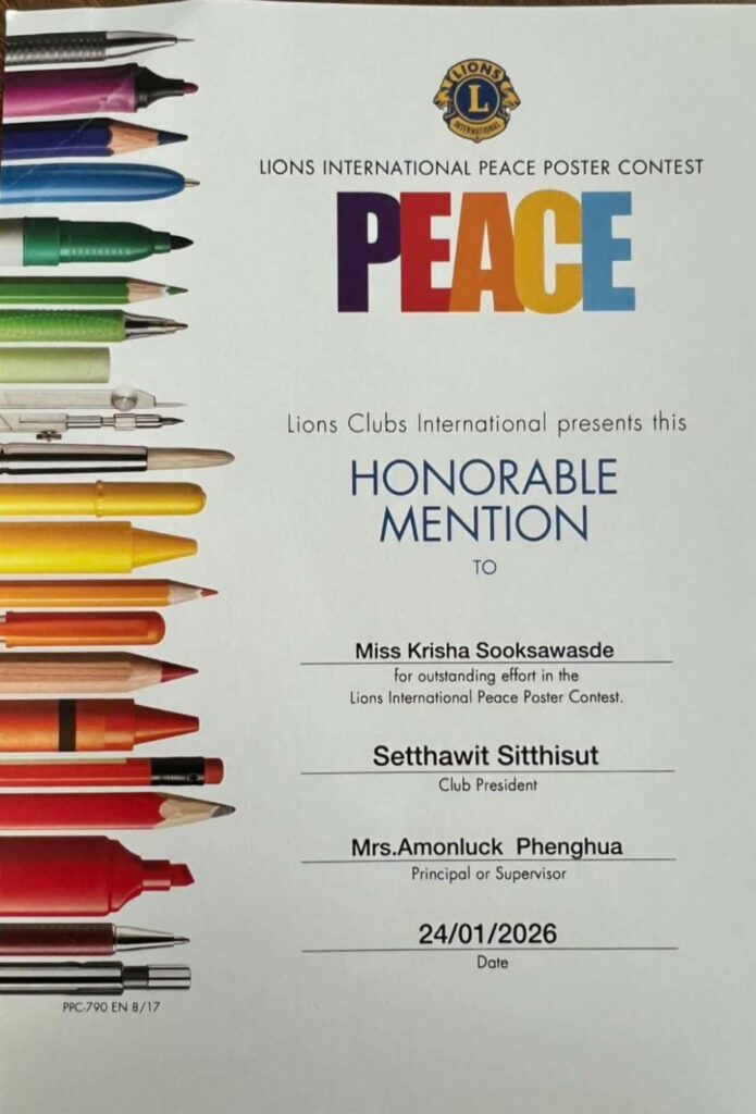 ด.ญ.คริชา สุขสวัสดิ์ รับรางวัล รองชนะเลิศอันดับ 1 ประกวดวาดภาพโปสเตอร์เพื่อสันติภาพ ประจำปีบริหาร 2568 ถึง 2569 / ผลงานดีเด่น / By สุธน ภักดี ด.ญ.คริชา สุขสวัสดิ์ ม.1/8 ได้รับรางวัล รองชนะเลิศอันดับ 1 ถ้วยรางวัล พร้อมทุนการศึกษา จำนวน 3,000 บาท จากการประกวดวาดภาพโปสเตอร์เพื่อสันติภาพประจำปีบริหาร 2568 ถึง 2569 ภายใต้คำขวัญ Together As One จากสโมสรไลออนส์สากล Post Views: 9