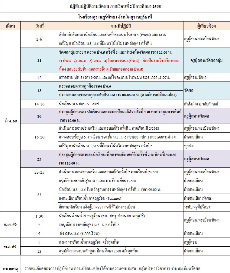 ปฏิทินปฏิบัติงานวัดผล ภาคเรียนที่ 2 ปีการศึกษา 2568 / ข่าวประชาสัมพันธ์ / By สุธน ภักดี Post Views: 7