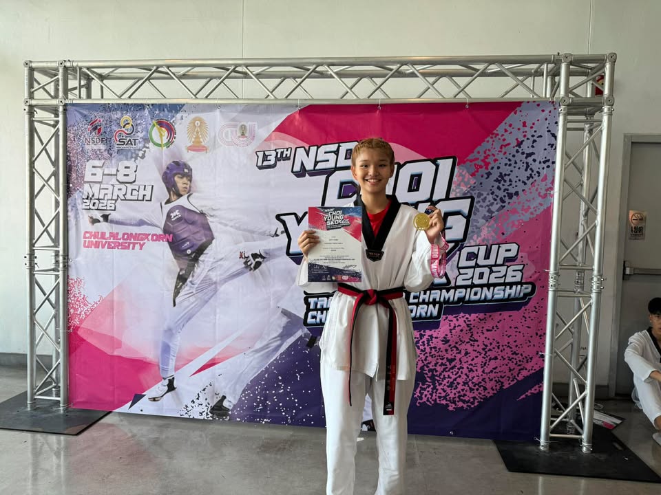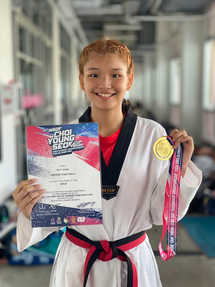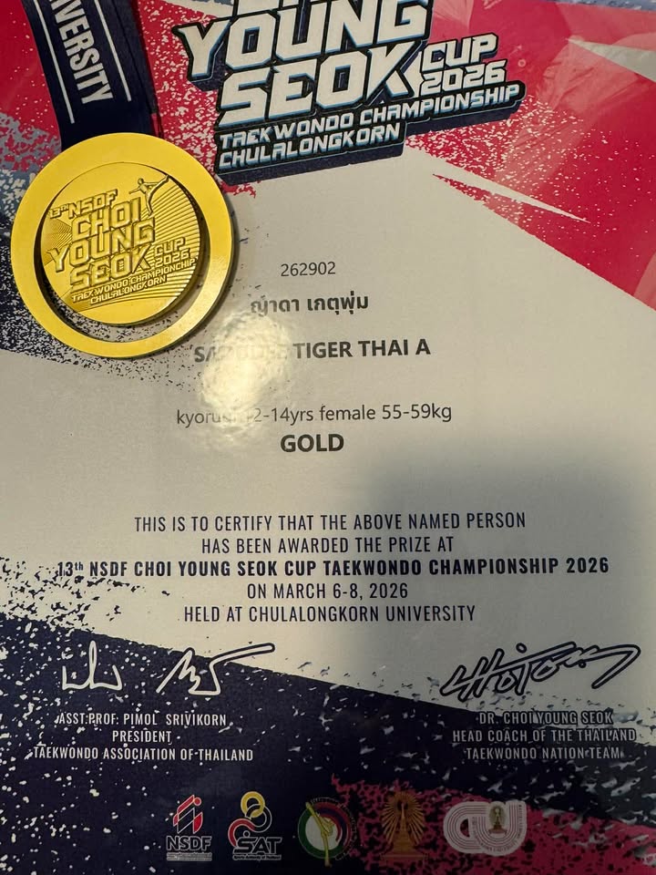 ด.ญ.ญาดา เกตุพุ่ม รับรางวัลเหรียญทอง 13th NSDF CHOI YOUNG SEOK CUP TAEKWONDO CHAMPIONSHIP 2026 / ผลงานดีเด่น / By สุธน ภักดี ด.ญ.ญาดา เกตุพุ่ม ม.1/7 ได้รับรางวัลเหรียญทอง ประเภท kyorugi 12-14 ปี หญิง น้ำหนัก 55-59 กก.รายการ 13th NSDF CHOI YOUNG SEOK CUP TAEKWONDO CHAMPIONSHIP 2026 แข่งขัน ณ จุฬาลงกรณ์มหาวิทยาลัย Post Views: 10