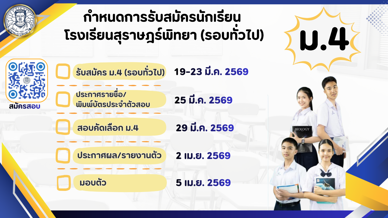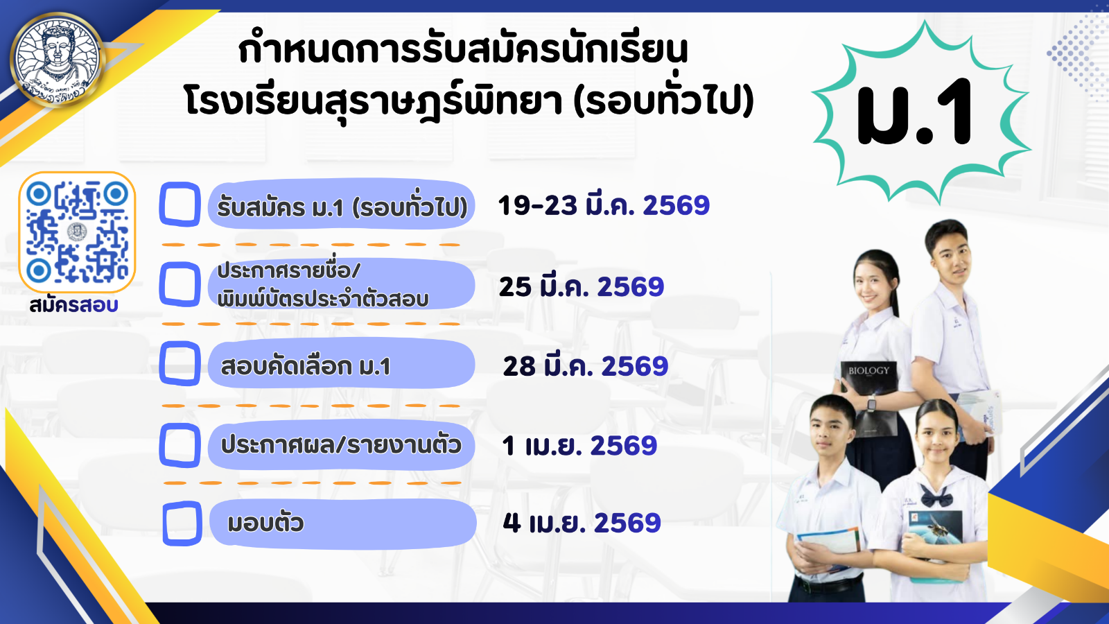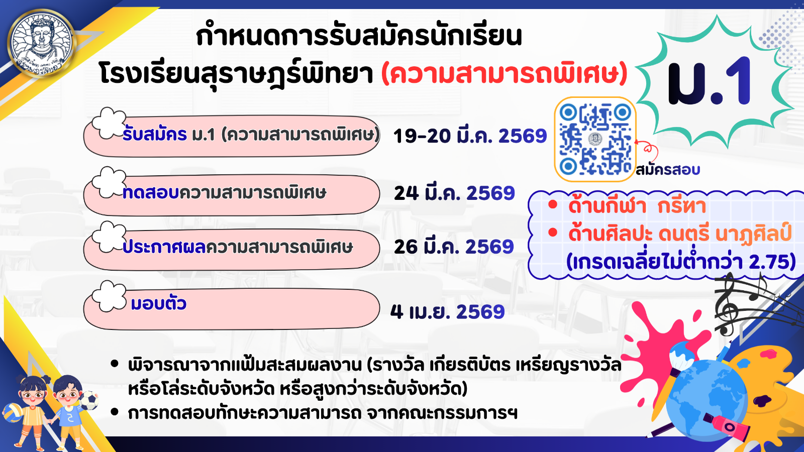 *นักเรียนที่สมัครประเภทความสามารถพิเศษ กรณีไม่ได้รับการคัดเลือก ยังคงมีสิทธิ์สอบรอบทั่วไปตามปกติ