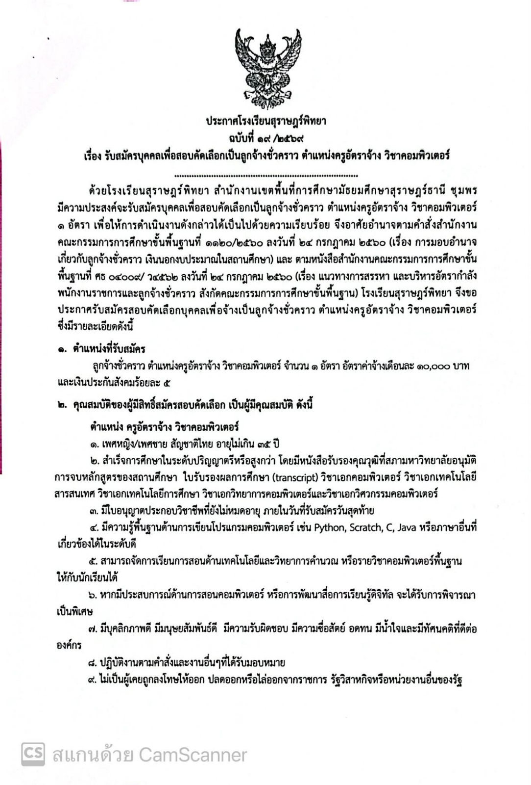 รับสมัครบุคคลเพื่อสอบคัดเลือกเป็นลูกจ้างชั่วคราว ตำแหน่งครูอัตราจ้าง วิชาคอมพิวเตอร์ / ข่าวประกาศ / By สุธน ภักดี Post Views: 4