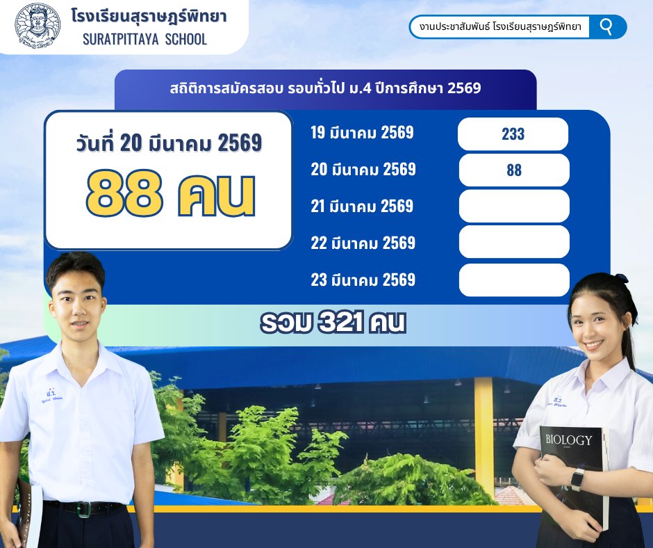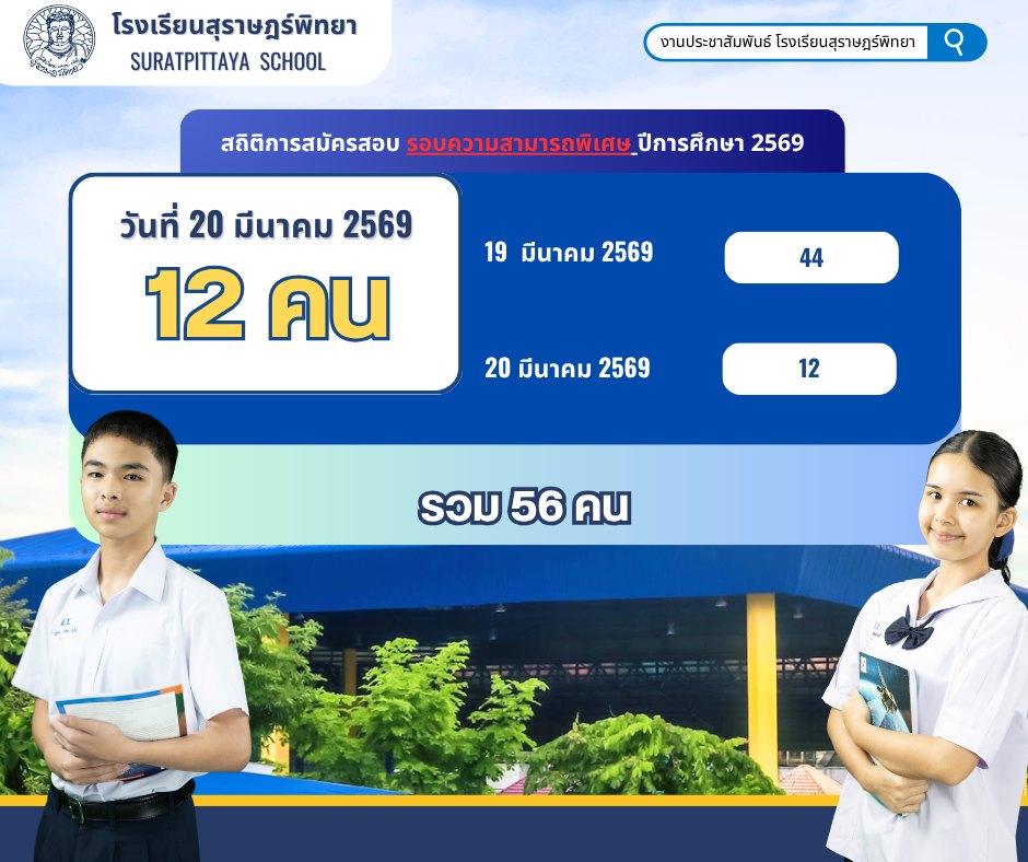 สถิติการสมัครเข้าสอบรอบทั่วไปและความสามารถพิเศษ ปีการศึกษา 2569 วันที่ 20 มีนาคม 2569 / ข่าวประชาสัมพันธ์, โรงเรียนแข่งขันสูง / By สุธน ภักดี สถิติการสมัครเข้าสอบรอบทั่วไปและความสามารถพิเศษ โรงเรียนสุราษฎร์พิทยาระดับชั้น ม.1 และ ม.4 ปีการศึกษา 2569 วันที่ 20 มีนาคม 2569ระดับชั้นมัธยมศึกษาปีที่ 1 ผู้สมัครสอบรอบทั่วไป จำนวน 165 คนผู้สมัครสอบรอบความสามารถพิเศษ จำนวน 12 คนระดับชั้นมัธยมศึกษาปีที่ 4 ผู้สมัครสอบ จำนวน 88 คน Post Views: 4