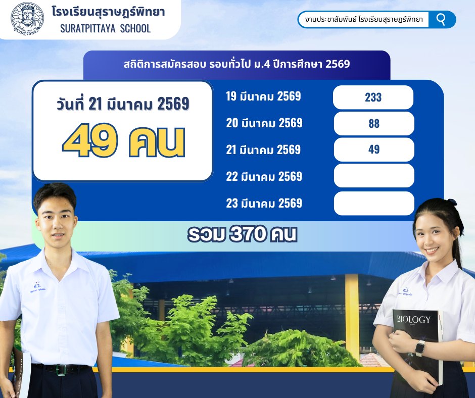 สถิติการสมัครเข้าสอบรอบทั่วไป ปีการศึกษา 2569 วันที่ 20 มีนาคม 2569 / ข่าวประชาสัมพันธ์, โรงเรียนแข่งขันสูง / By สุธน ภักดี สถิติการสมัครเข้าสอบรอบทั่วไป โรงเรียนสุราษฎร์พิทยา ระดับชั้น ม.1 และ ม.4 ปีการศึกษา 2569 วันที่ 21 มีนาคม 2569 ระดับชั้นมัธยมศึกษาปีที่ 1 ผู้สมัครสอบรอบทั่วไป จำนวน 43 คน ระดับชั้นมัธยมศึกษาปีที่ 4 ผู้สมัครสอบ จำนวน 49 คน Post Views: 2
