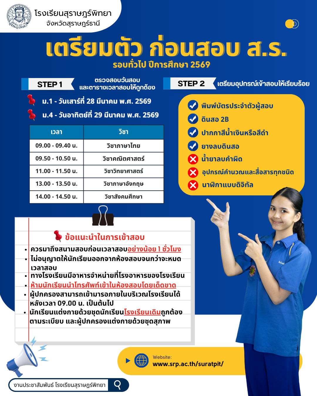 เตรียมตัวก่อนสอบ รอบทั่วไป ปีการศึกษา 2569 / ข่าวประชาสัมพันธ์, โรงเรียนแข่งขันสูง / By สุธน ภักดี *กรณีนักเรียน ค้นหารายชื่อไม่พบ ให้แจ้งชื่อ นามสกุล ทางกล่องข้อความ https://www.facebook.com/suratpit พิมพ์บัตรประจำตัวคลิกที่นี่ Post Views: 15