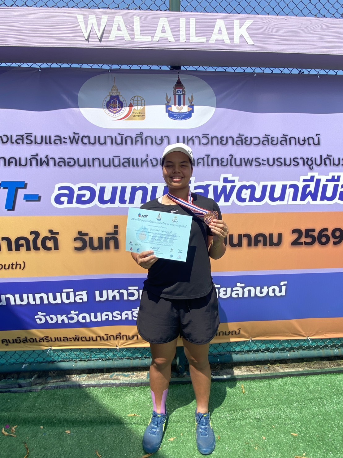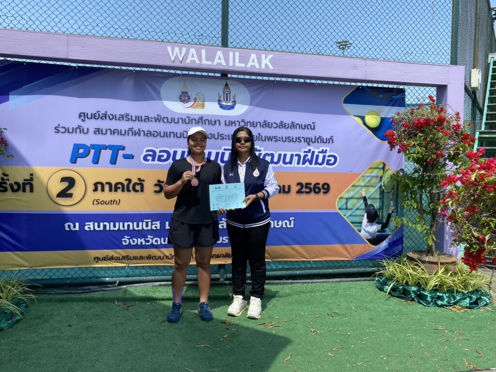 น.ส.ณัฐหทัย อินทร์ทรัพย์ รับรางวัลรองเลิศอันดับ 2 PTT-ลอนเทนนิสพัฒนาฝีมือภาคใต้ครั้งที่ 2 ประจำปี 2569 / ผลงานดีเด่น / By สุธน ภักดี น.ส.ณัฐหทัย อินทร์ทรัพย์ ม.3/7 ได้รับรางวัลรองเลิศอันดับ 2 ประเภทรุ่นหญิงเดี่ยวอายุไม่เกิน 18 ปี รายการ PTT-ลอนเทนนิสพัฒนาฝีมือภาคใต้ครั้งที่ 2 ประจำปี 2569 ณ สนามเทนนิสภายในมหาวิทยาลัยวลักษณ์ จังหวัดนครศรีธรรมราช ระหว่างวันที่ 21 – 22 มีนาคม 2569 Post Views: 12