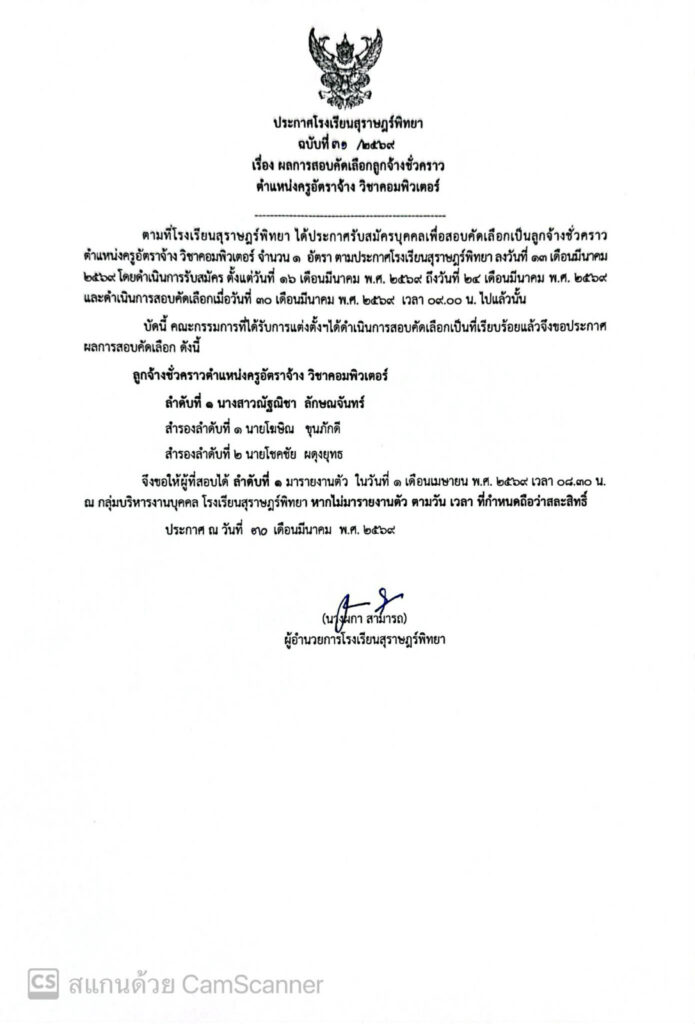 ประกาศผลการสอบคัดเลือกลูกจ้างชั่วคราว ตำแหน่งครูอัตราจ้าง วิชาคอมพิวเตอร์ / ข่าวประกาศ / By สุธน ภักดี Post Views: 23